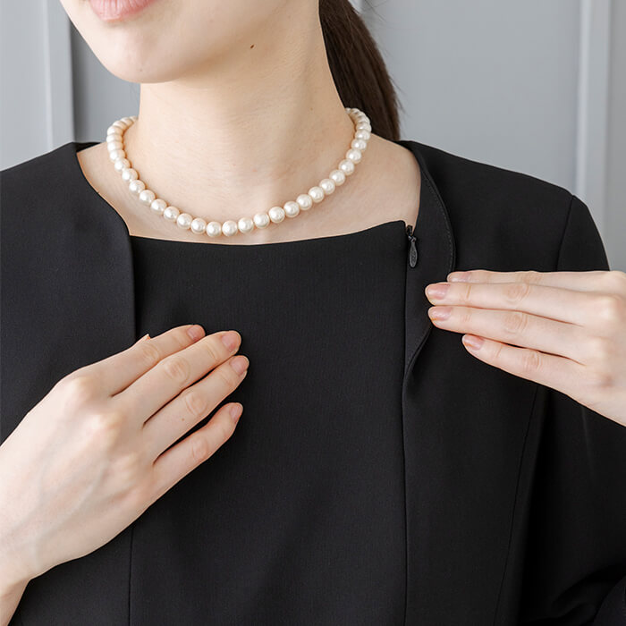 シンプルなノーカラーのジャケットにシフォン袖がポイントの前開きワンピースを合わせたアンサンブル。 ジャケットの袖はスリット入りで折り返せばカフスとして着用できる補正不要の便利なデザイン。 フロントは3箇所のカギホックで留められる仕様になっています。 一枚仕立てのトリックワンピースは、ウエストのサテンがアクセント。 肘が隠れる七分袖は軽やかなシフォン。 暑い季節はワンピース一枚でもきちんとした印象です。 使用している生地は、喪服として安心な濃染加工による深黒の二重織。 流行に左右されないデザインで、長くご愛用いただけます。