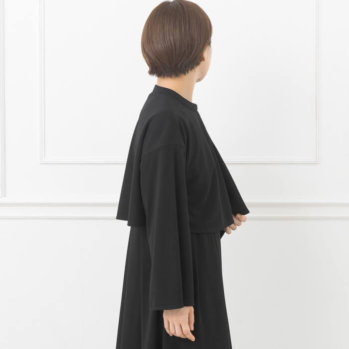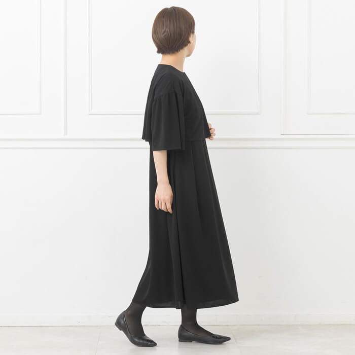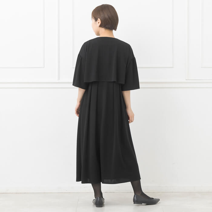 ケープ付きのワンピースは、脇部分をあえて縫わないアームフリーという仕立て方を採用。 腕を上げてもつられてウエスト部分が上がることがないので、着やすくシルエットも美しいままです。