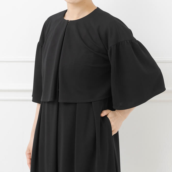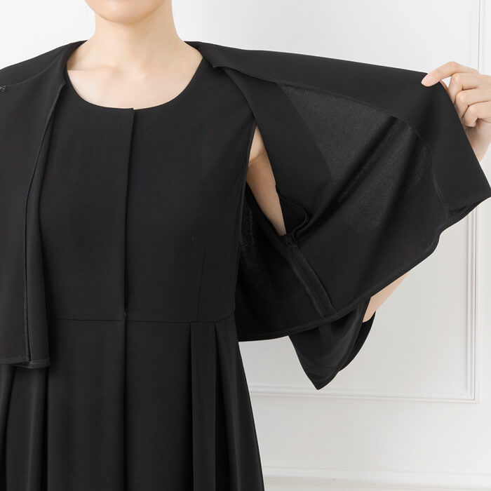 ワンピースはクラシカルなボレロをケープ風にアレンジ。裾ラインにフレアを効かせ大人のかわいさを表現しました。 前開きファスナーやアームフリー仕様、両脇ポケットなど、着心地にもこだわっています。