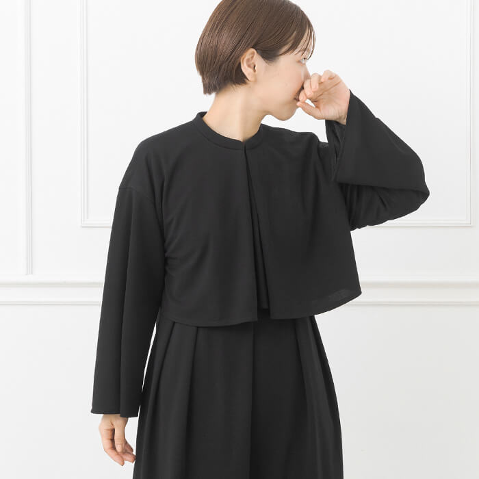 使用した素材は、フォーマルではめずらしいニット素材。伸びがいいので着心地がよく、シワになりにくいので付属のポーチに畳んで入れることが可能です。
