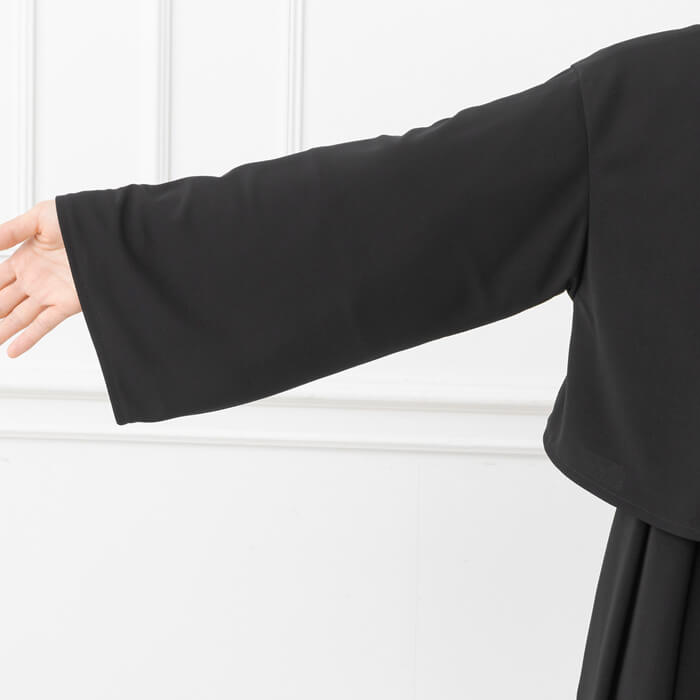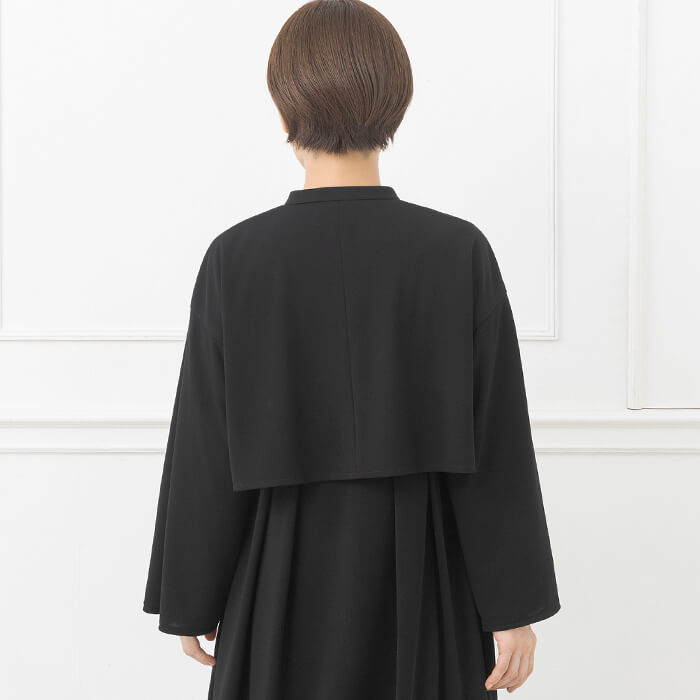 スタンドカラーのジャケットは落ち着きと気品を演出。短め丈で縦長効果も抜群です。 ゆったりとしたドロップショルダーは動きやすく、フレア袖は腕から指先までを細く長くみせてくれるところも、こだわりポイント。