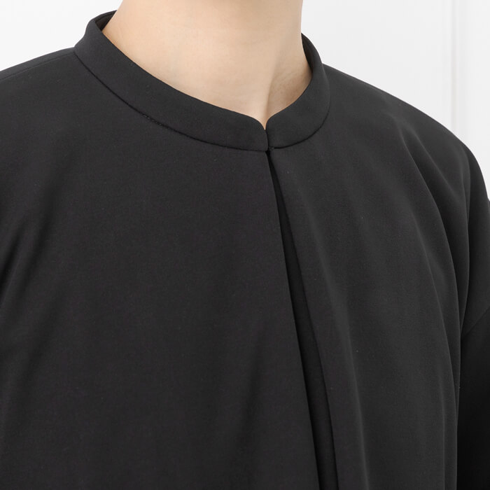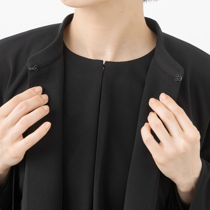首元が美しく見える高さをミリ単位で調整しました。スタンドカラーのジャケットは落ち着きと気品を演出します。