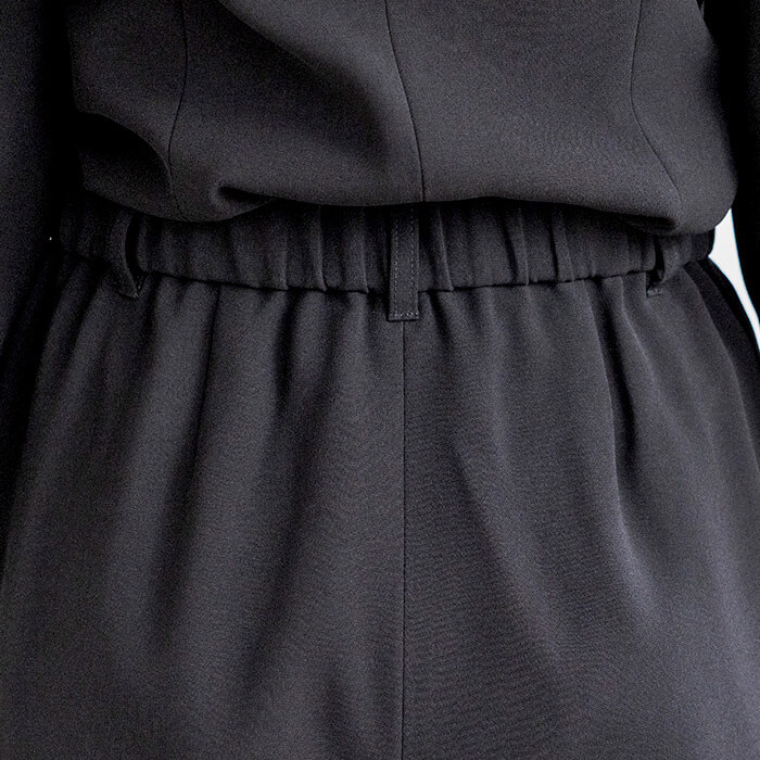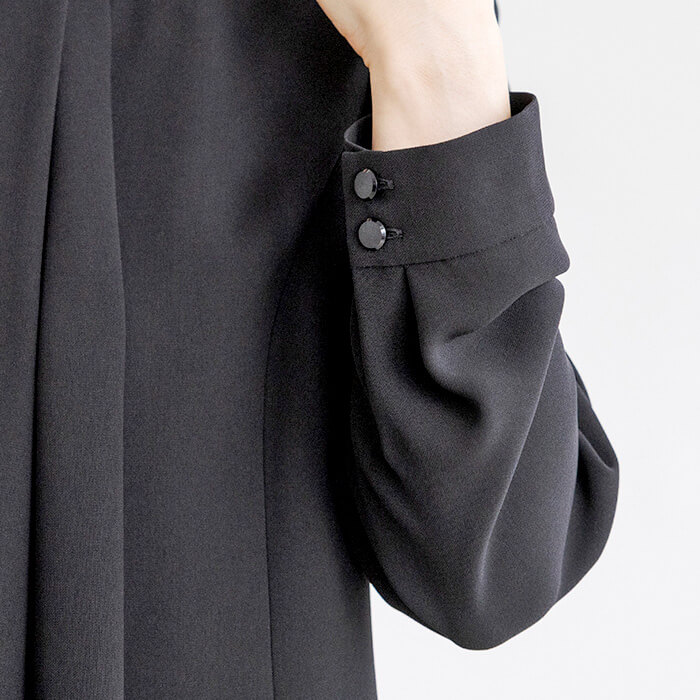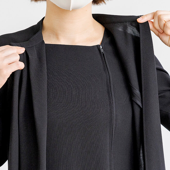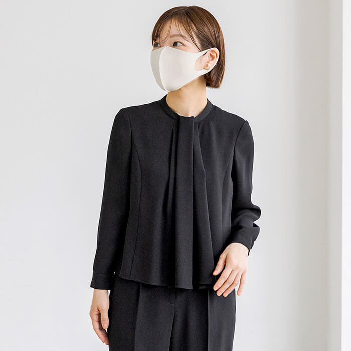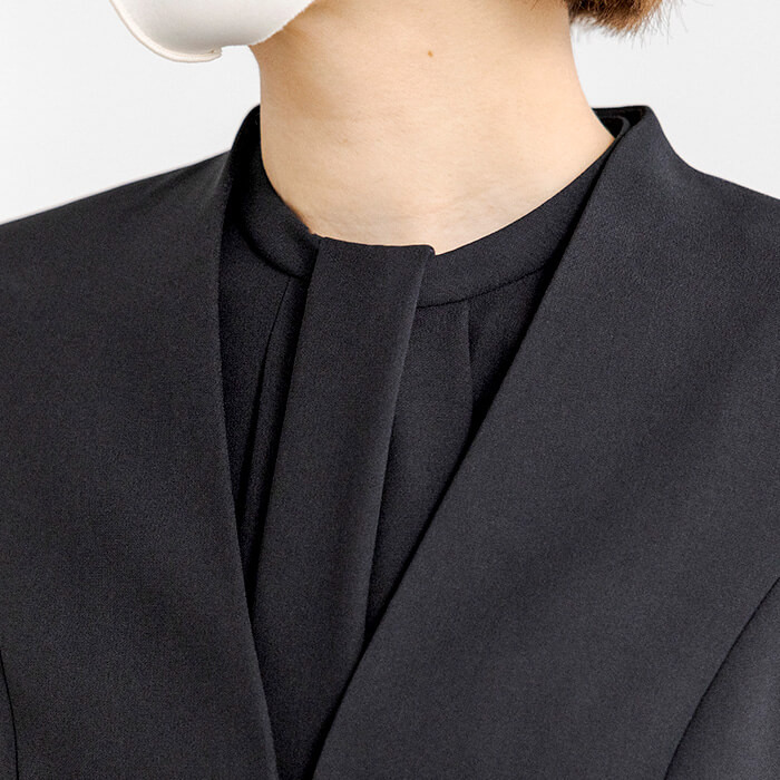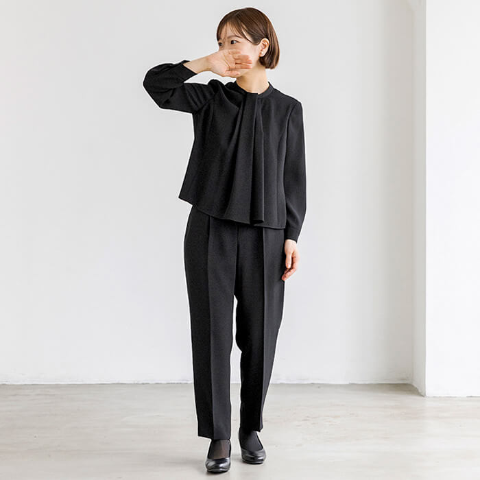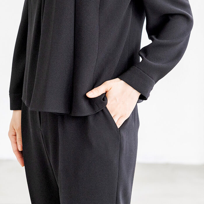 パンツ丈のお直しがいらず、テーパードパンツのシルエットをキープしたまま着用いただけるよう仕上げました。ジャケット襟は首回りをすっきりと見せる、ほど良い高さのスタンドカラーに。ブラウスはボウタイ風デザイン。着脱のしやすい前開きファスナー仕様です。また、ジャケットがなくても「きちんと感」をキープ出来るよう、カフス袖に仕上げました。パンツウエストはゴム仕様に。ストレスのない着用感がポイントです。