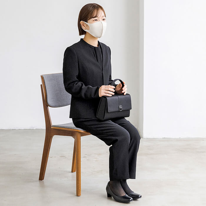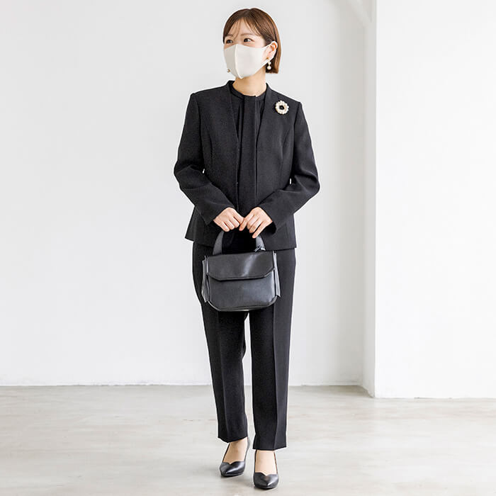パンツアイテムのブラックフォーマルを購入する小柄さんにぜひおすすめしたい、cahoさんお墨付きのパンツスリーピースです。