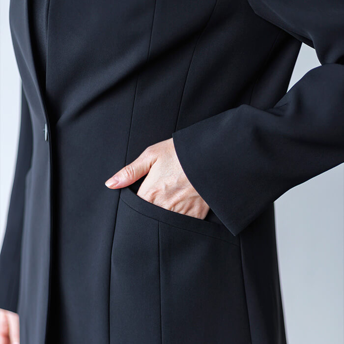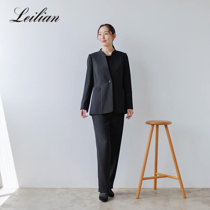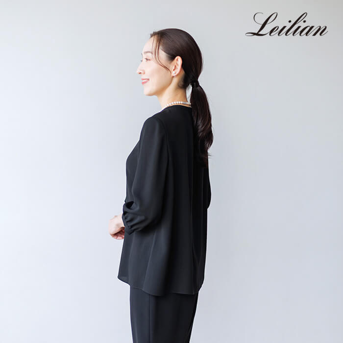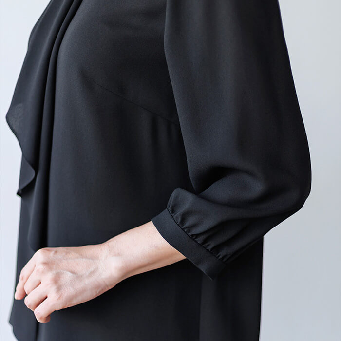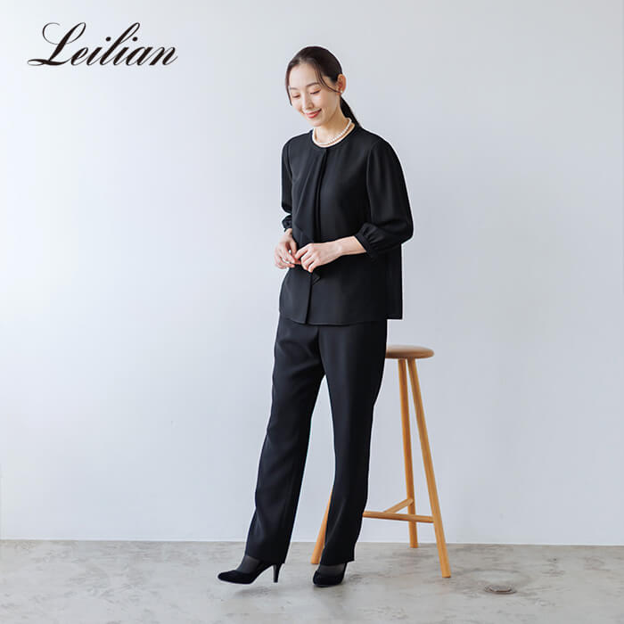 ジャケット、ブラウス、パンツ共にの濃染加工をしてる漆黒の生地を使用。参列者としてはもちろんのこと、喪主やご親族の立場にもおすすめできるブラックフォーマルです。お手持ちの商品と合わせて単品コーディネートも可能で、喪のシーン以外も着用できます。