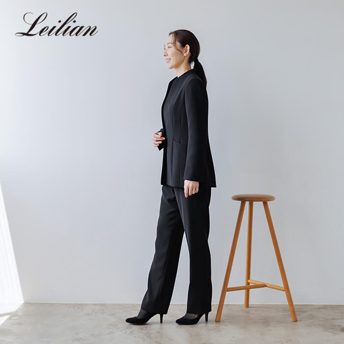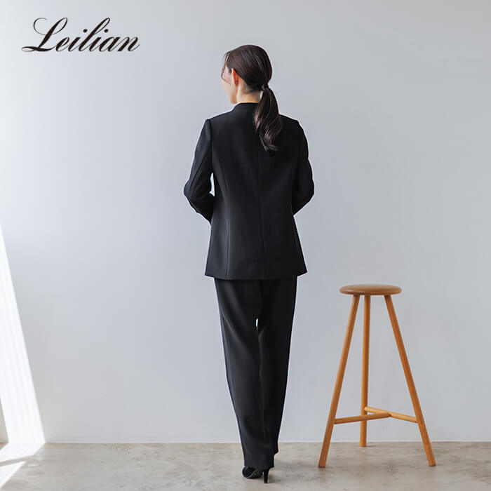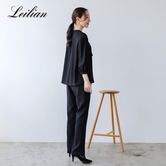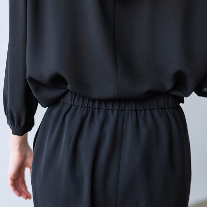 パンツはすっきりとしたストレートシルエット。縦ラインを意識した、動きやすいパンツスーツ。後ろウエストはゴム仕様で、フォーマルな見栄えを保ちながら、快適さも兼ね備えています。洗練されたきちんと感と、女性らしい柔らかさ。多様なシーンに寄り添う、大人のブラックフォーマルです。