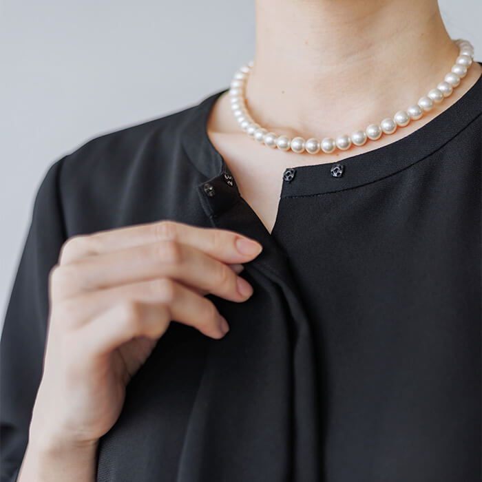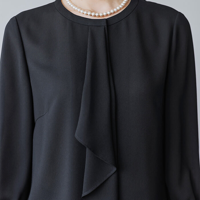ブラウスはボウタイを思わせるフリルデザイン。薄手の肌触りのよいジョーゼットを用いることで、涼やかで軽やかな着心地に仕上げました。暑さの厳しい夏でも、上品な華やかさを纏えます。