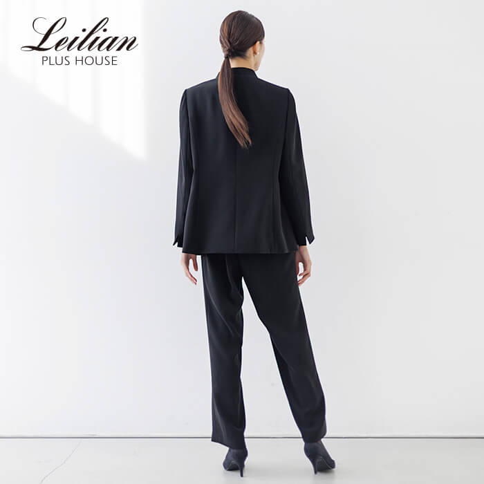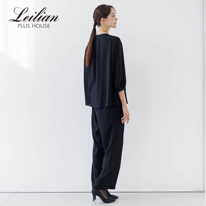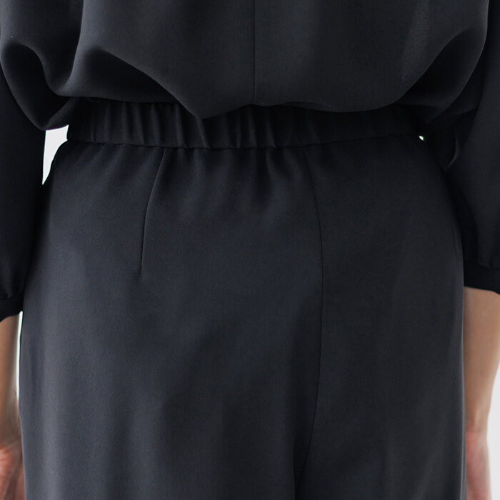 パンツはすっきりとしたストレートシルエット。縦ラインを意識した、動きやすいパンツスーツ。後ろウエストはゴム仕様で、フォーマルな見栄えを保ちながら、快適さも兼ね備えています。洗練されたきちんと感と、女性らしい柔らかさ。多様なシーンに寄り添う、大人のブラックフォーマルです。