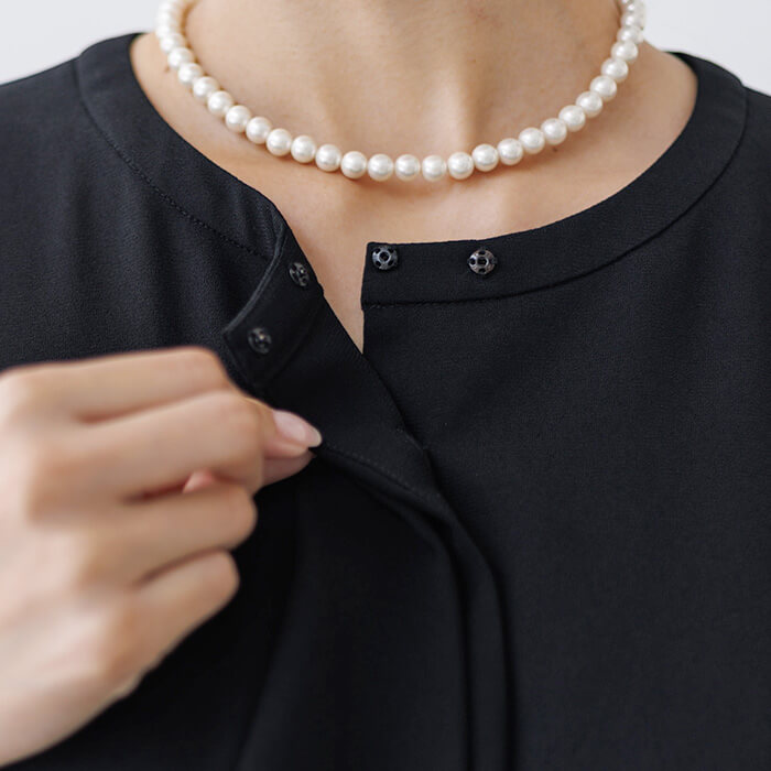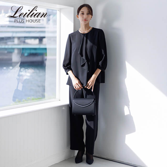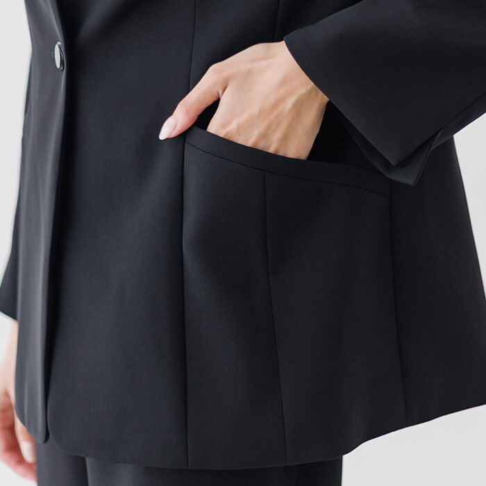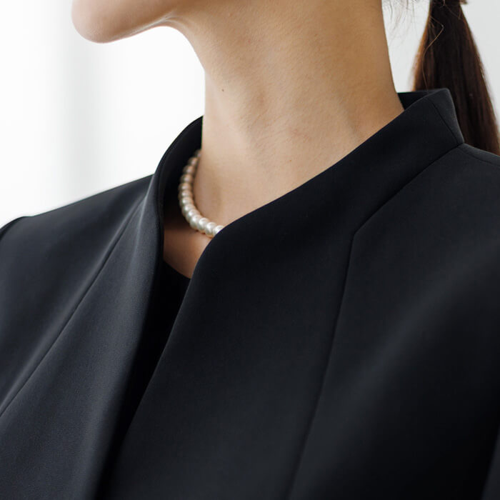 ジャケット、ブラウス、パンツ共にの濃染加工をしてる漆黒の生地を使用。参列者としてはもちろんのこと、喪主やご親族の立場にもおすすめできるブラックフォーマルです。お手持ちの商品と合わせて単品コーディネートも可能で、喪のシーン以外も着用できます。