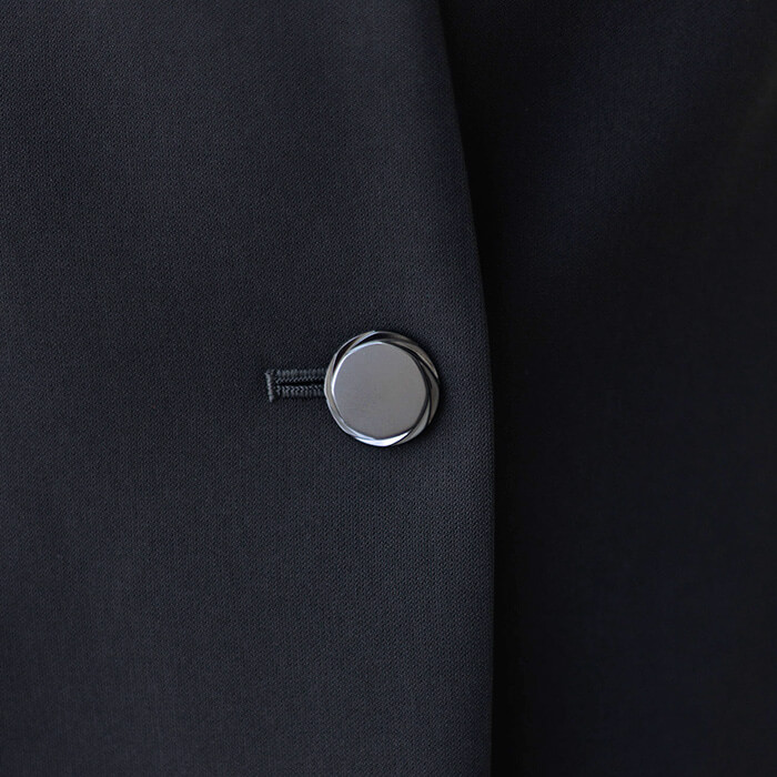 ジャケットは首元を優しく包み込むスタンドカラーで、凛とした印象を演出。Vカットのキーネックは、縦ラインを強調、シンプルながらも細部の仕立てが美しく際立ちます。着丈は長めで気になるウエストやヒップラインをさりげなく隠します。ボタンを外して着用しても、きちんと感を残しつつ軽やかなスタイルに。