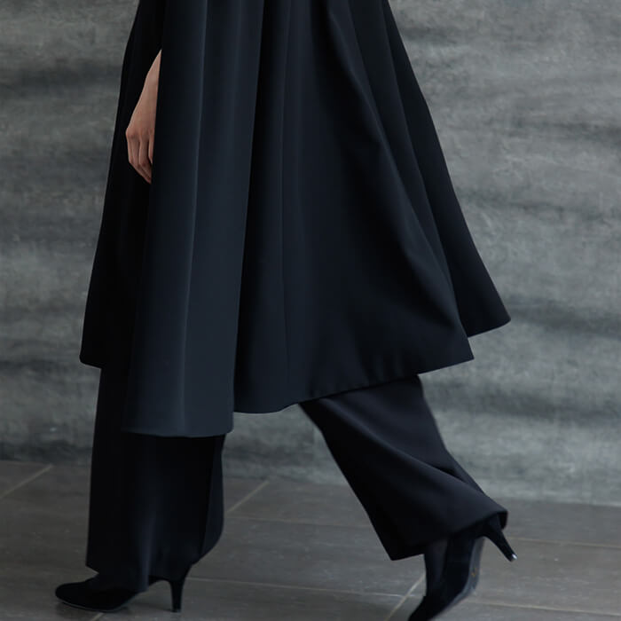歩く度に揺れる裾。ゆったりとした分量感はボディラインもカバーしつつ、落ち感がエレガントな印象に。