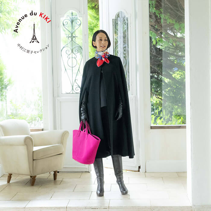 「きちんとしたジャケットやコートも大好きなのですが、やはり私はケープにとても惹かれてしまいます。年齢とともに、”きちんと”したものがきつく感じたり、肩が凝ってしまうことも…。その点、さらっと羽織れるケープはどんなものともバランスが良く、活躍の場がたくさんあると思います。こちらのケープは丈とトロッとした落ち感が美しく、どんなアイテムとも美しく合わせていただけると思います」