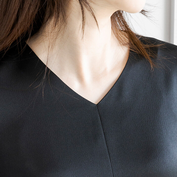 デコルテを美しく見せるVネックは、顔まわりをすっきり見せ、細見え効果も。
