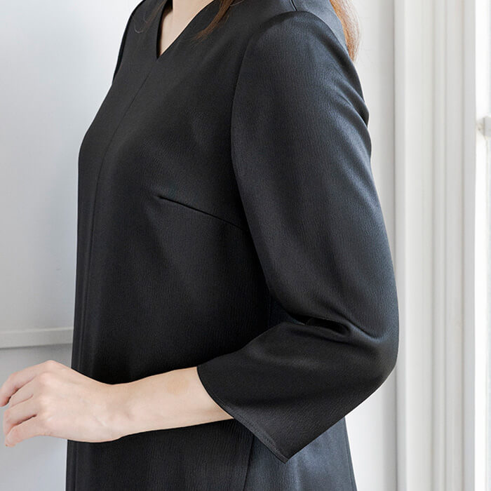 上品な光沢とストレッチ性を兼ね備えた表情豊かなサテン素材を使用。すっきりとしたVネックがデコルテを美しく見せ、動くたびに揺れる後ろ下がりのヘムラインがクラシカルな印象を演出します。シンプルながらも洗練されたシルエットで、フォーマルにもデイリーにも対応。軽やかな着心地と華やかさを両立した、大人のためのエレガントワンピースです。