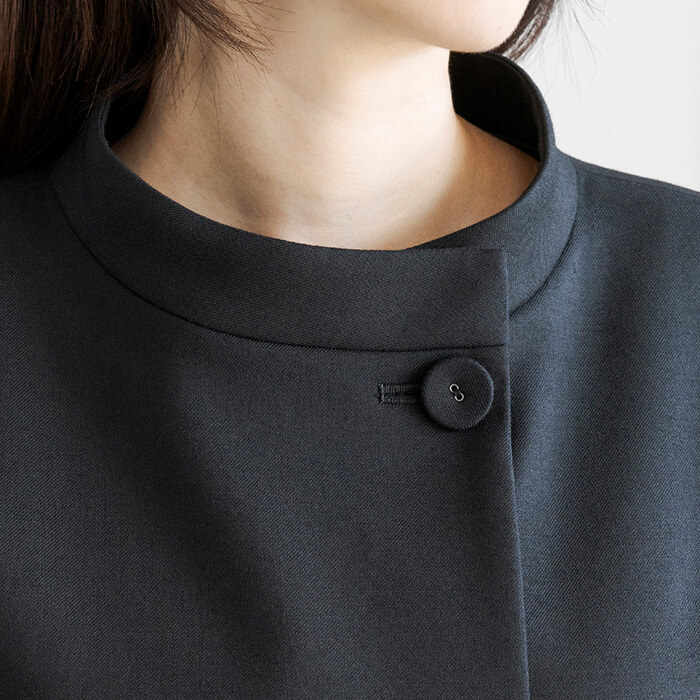 スタンドカラーが首元をすっきり見せつつ、上品な立ち上がりで洗練感をプラスします。