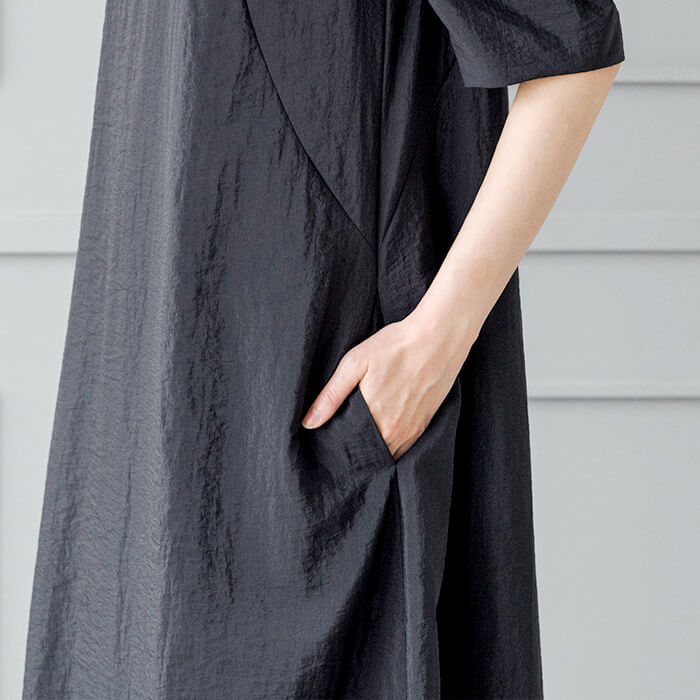 程よいAラインシルエットに、タックで形どった袖がポイント。ジャケットを羽織ってきちんとしたスタイルに。また、中にタートルをレイヤードしてもかわいいです。1年を通して着られる、綺麗めな黒のワンピース。両サイドに便利なポケット付き。