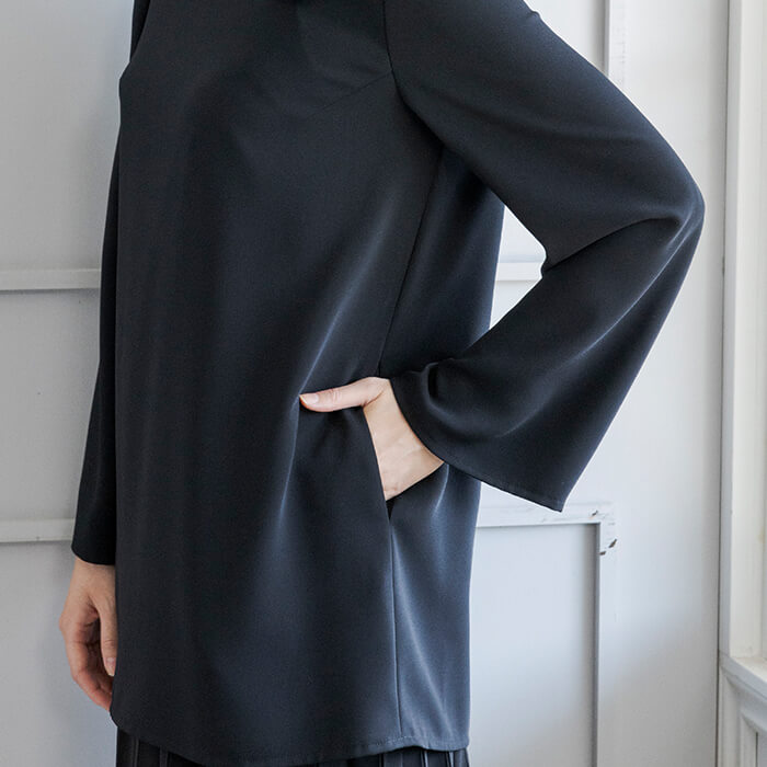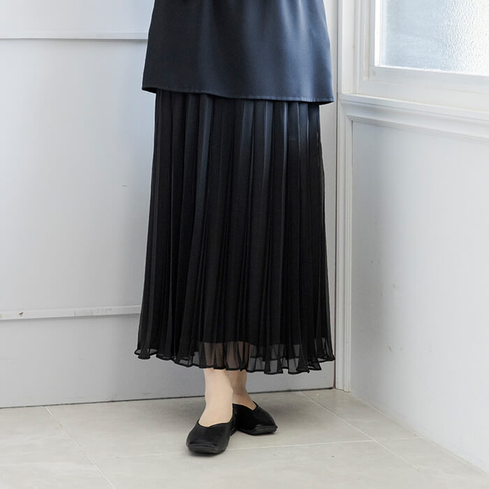 裾からのぞくプリーツが、動くたびにふわっと揺れ、軽やかで女性らしい印象を演出。