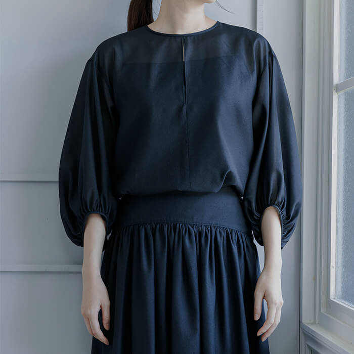 シアー素材で仕立てた、ワンピース見えの着映え力セットアップ。程よい透け感が軽やかさを演出し、上品さと今っぽさを兼ね備えた一着です。