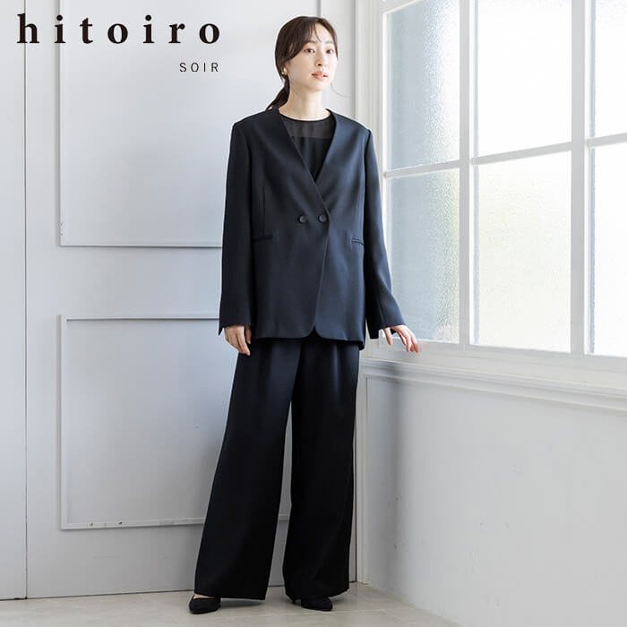 『特別な日も私の日常に、私が着たい服』。『hitoiro SOIR(ヒトイロソワール)』は、ディテールを楽しめる色『黒』をイメージカラーに、かしこまりすぎず、リラックス感がありながらも大人のドレッシーさを感じられるフォーマルメーカーならではの¨大切な日に着たい黒の洋服。