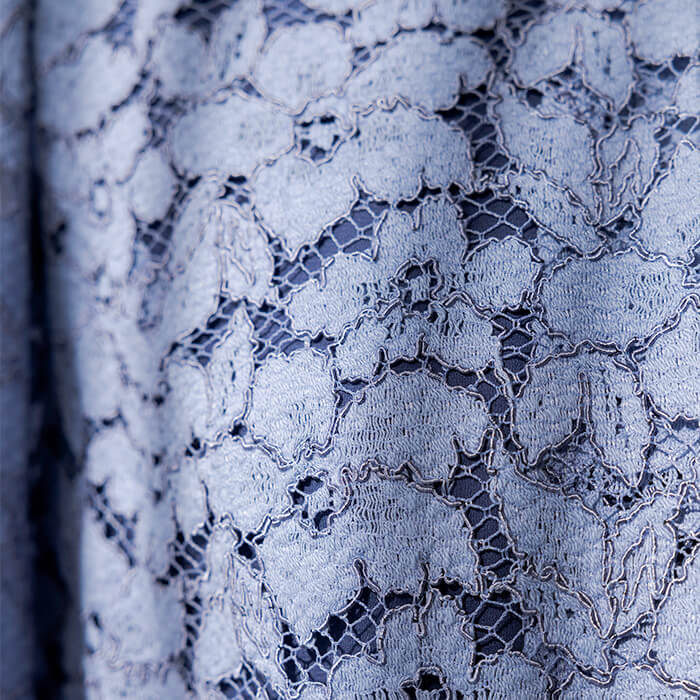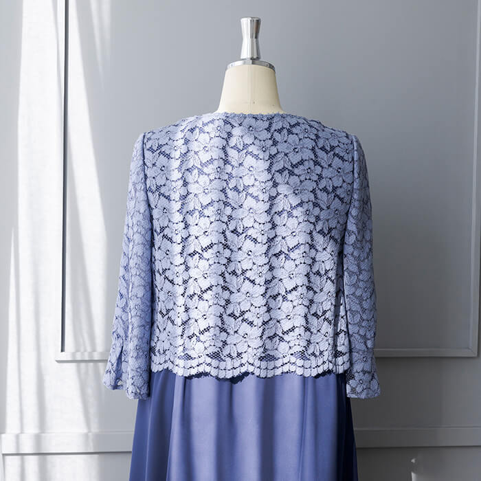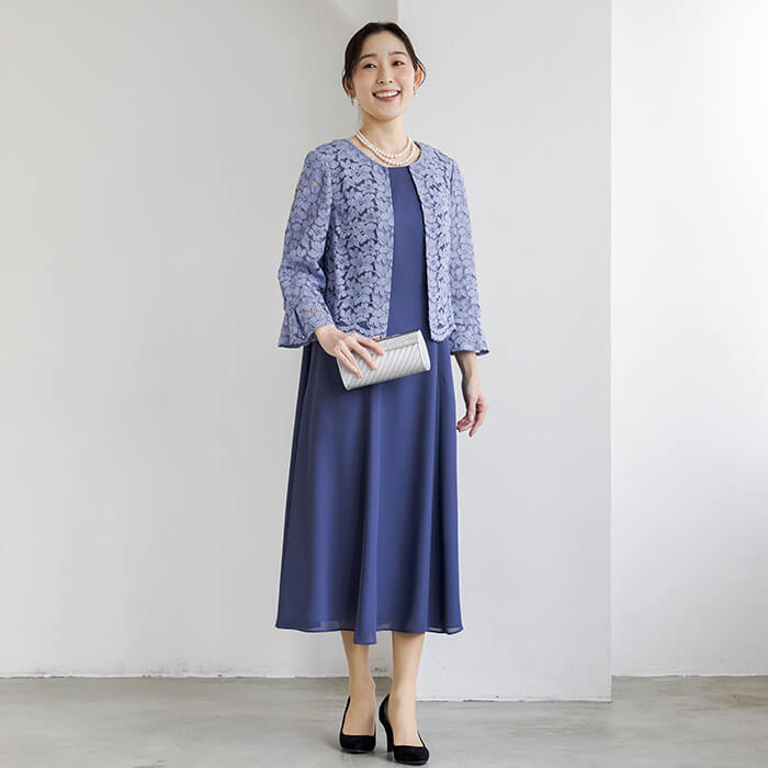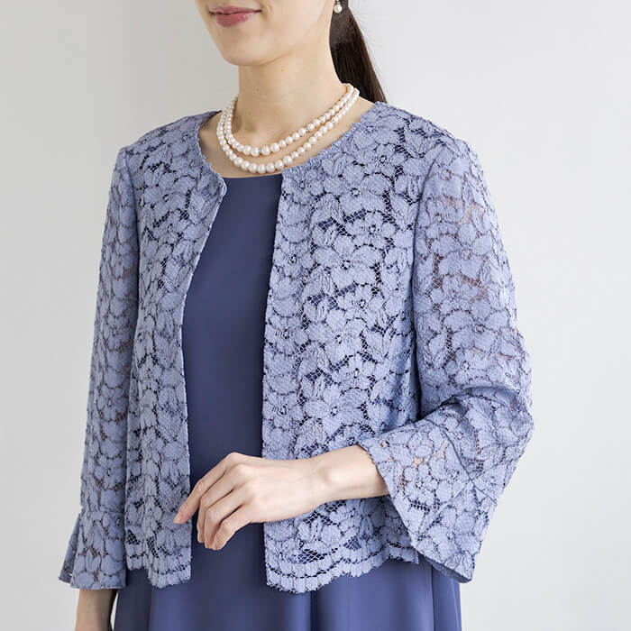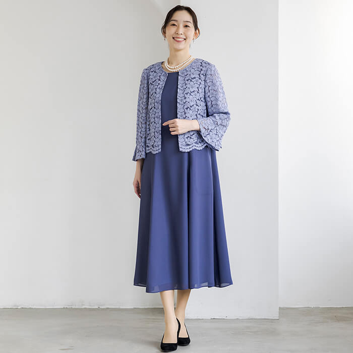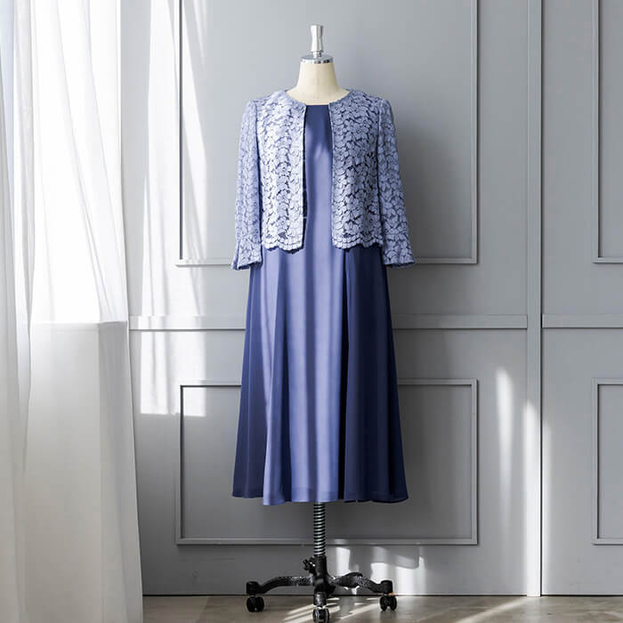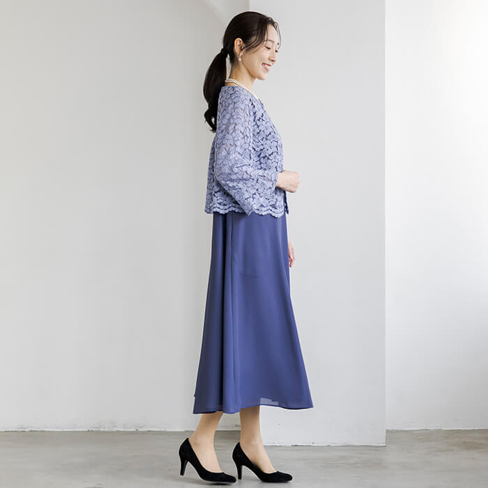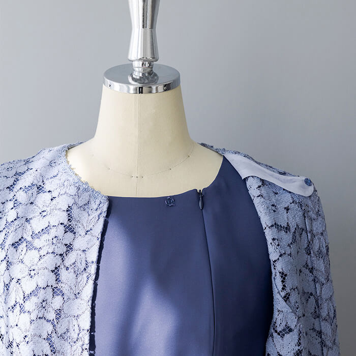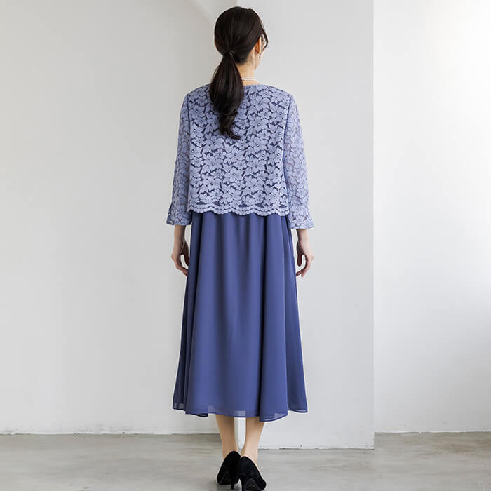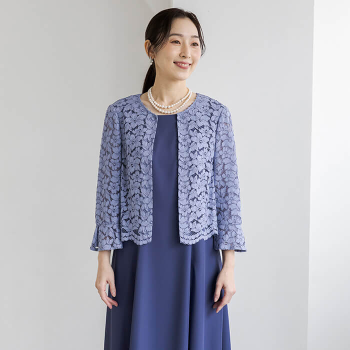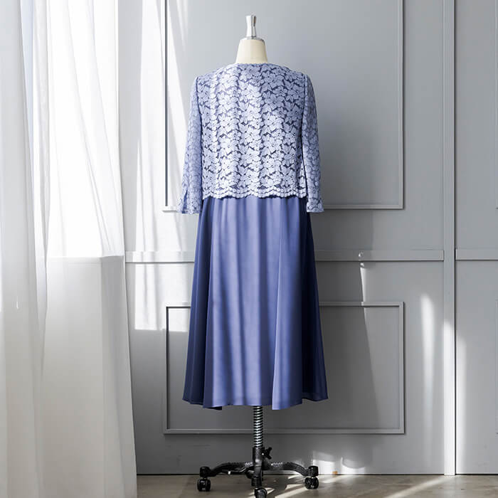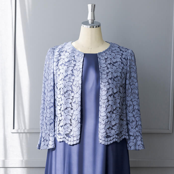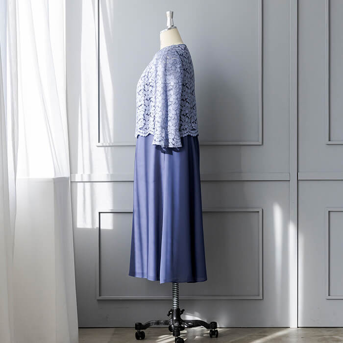 上品なAラインシルエットが魅力のドレス。清涼感をレース素材で表現、爽やかな印象です。動く度にゆれ動く裾がエレガント。 上身頃はボレロを羽織ったようなデザインで、気になるウエスト部分をカバーします。襟ぐりのブレードとスカラップを生かしたウエスト部分は高級感ある仕立てに。 背面のウエスト部分はゴム仕様でリラックスした着用感がポイント。両サイドには便利なポケット付き。前開きのファスナーで、楽に着脱ができます。