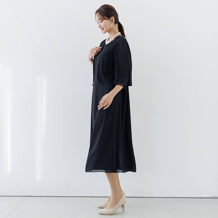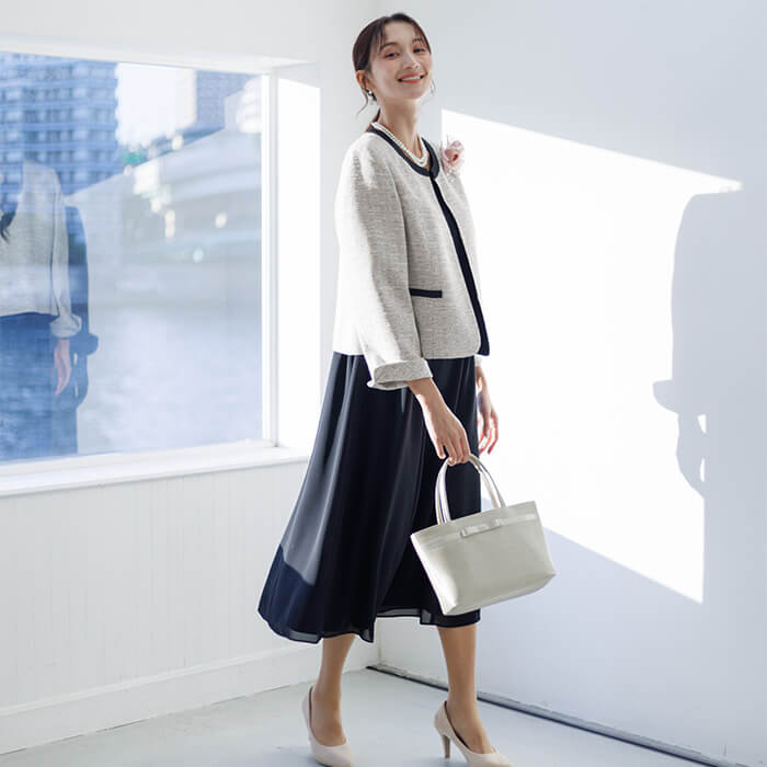 卒業式や入学式、七五三、顔合わせなどにおすすめ。ジャケットは仕事や学校行事にも合わせられます。 ワンピースは結婚式に使用できます。 「ゆったり」に比べてウエストとヒップを中心にさらにゆとりを持たせたプラスサイズ。基準身長は158cmです。