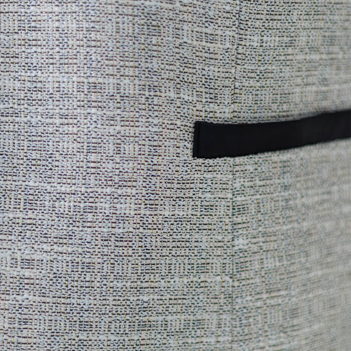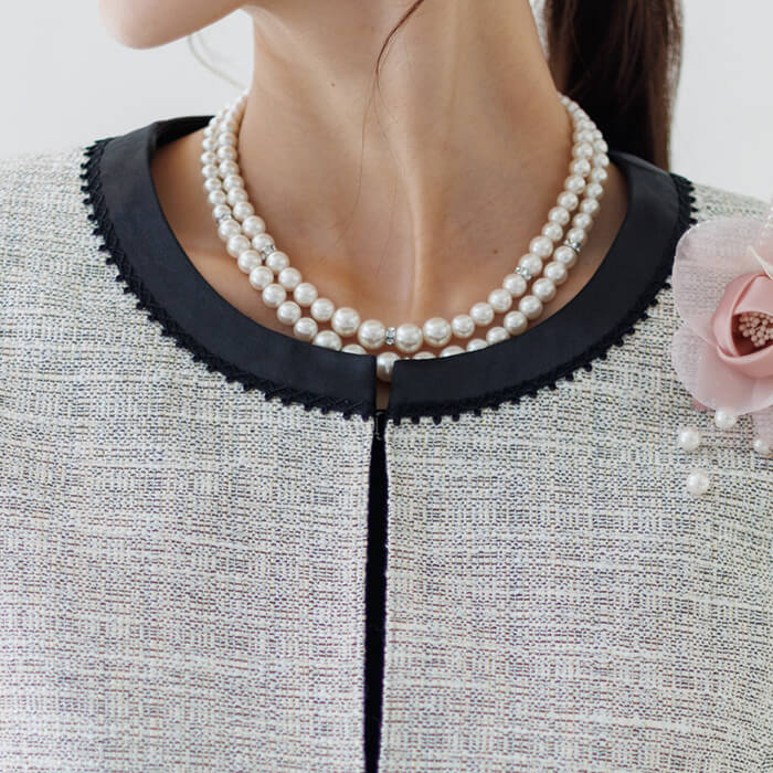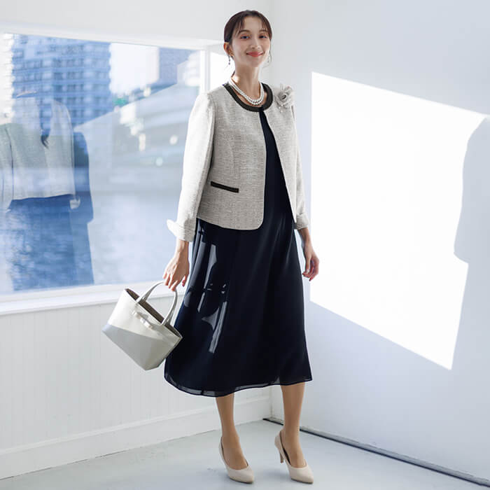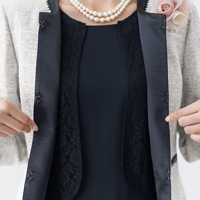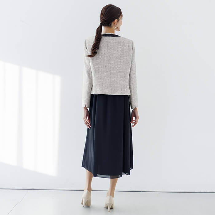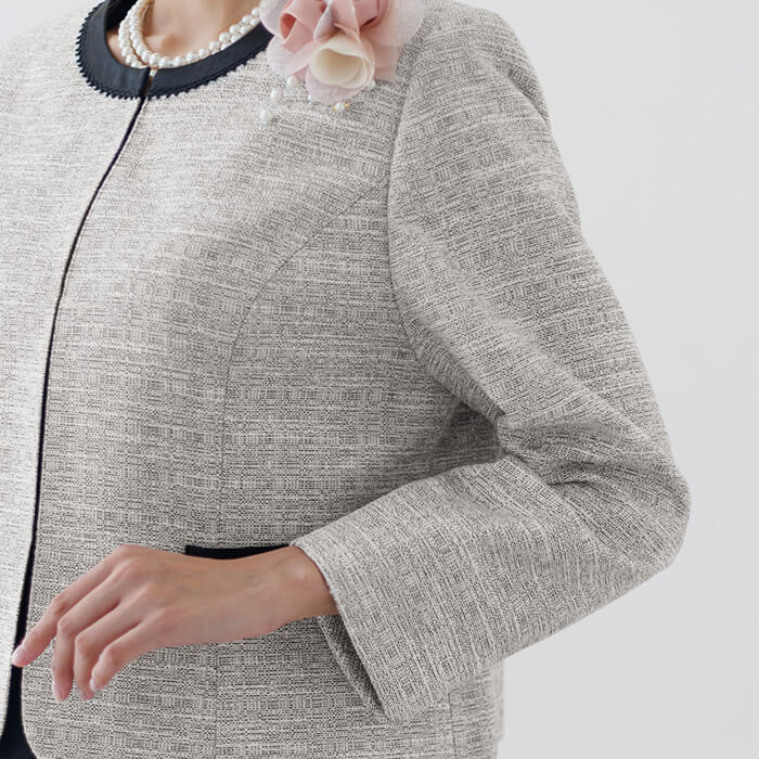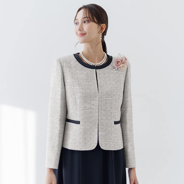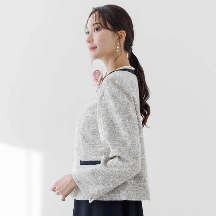 ベーシックなノーカラージャケットは、どんなフォーマルシーンにもマッチするデザイン。 ツイード素材は、ベージュ・ピンク・ネイビーの糸を使い、ゴールドとシルバーのラメで仕上げました。きちんと上品に見える仕立てです。襟ぐりの切り替えは全体を引き締める効果があります。