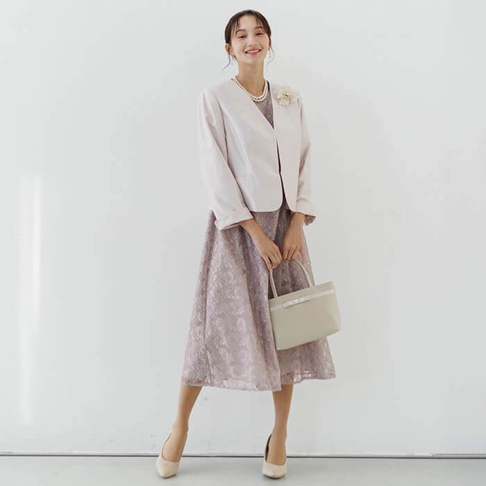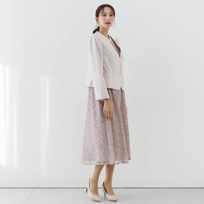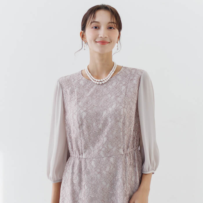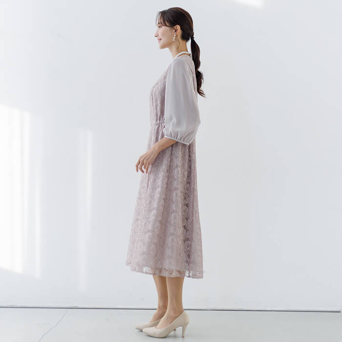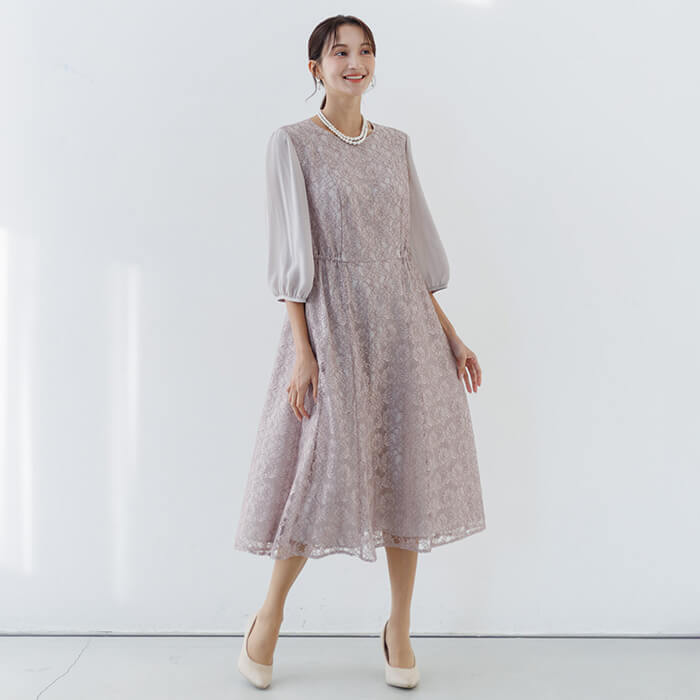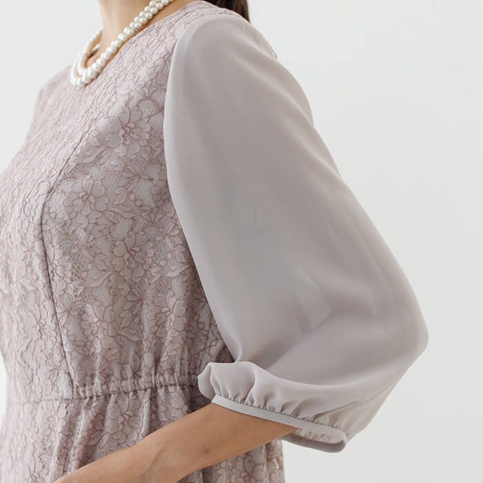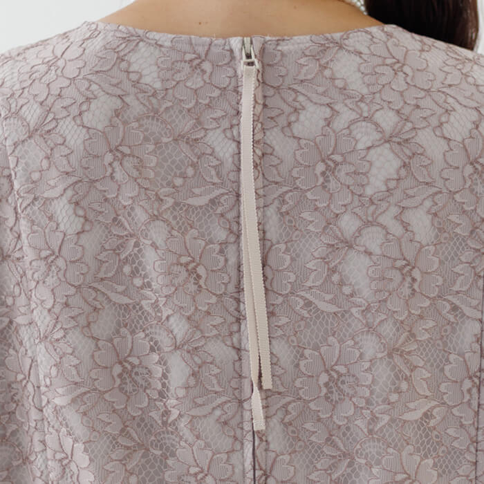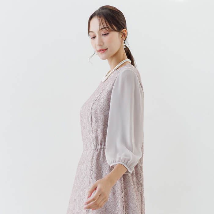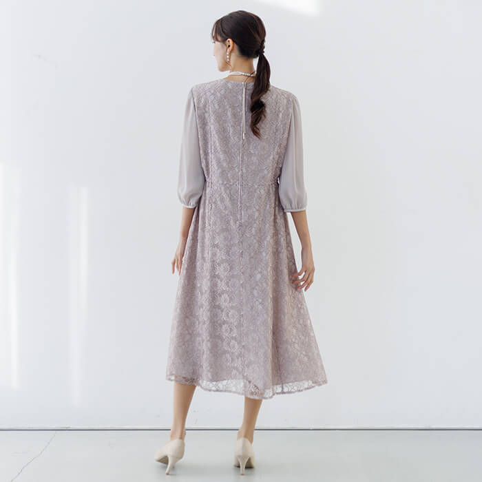 ワンピースは総レースのフェミニンな王道ドレス。袖は無地のジョーゼットで仕立て、程よい透け感に。 ウエストの脇はゴム仕様で、楽に着用できます。背面のファスナーにはリボンが付いており、楽に着脱できます。