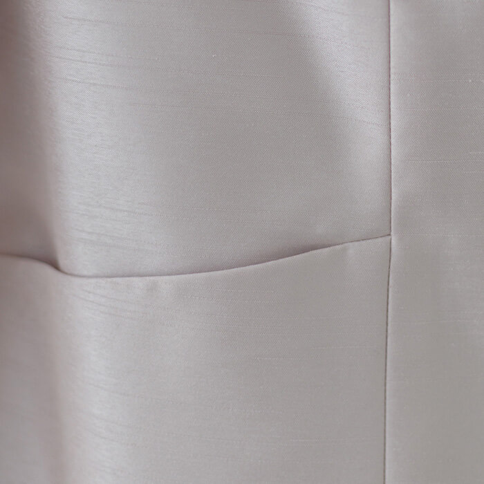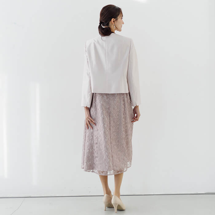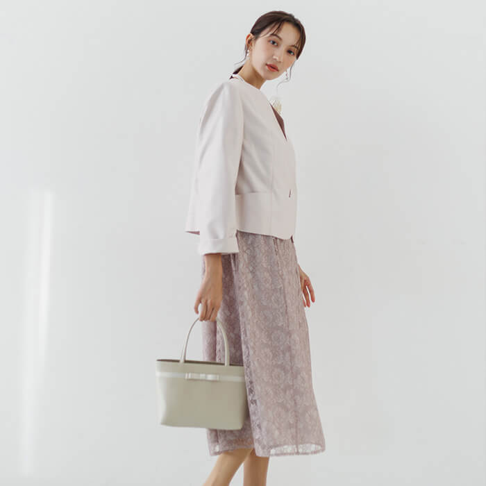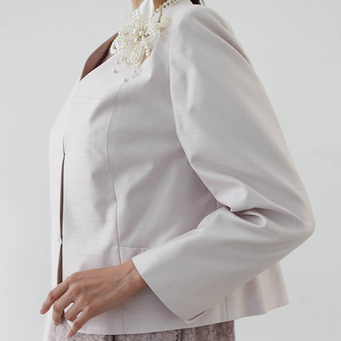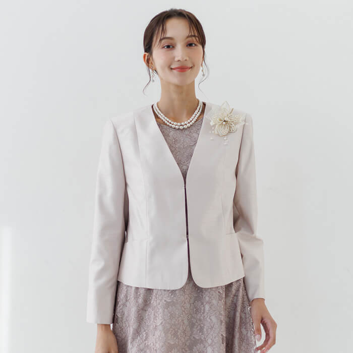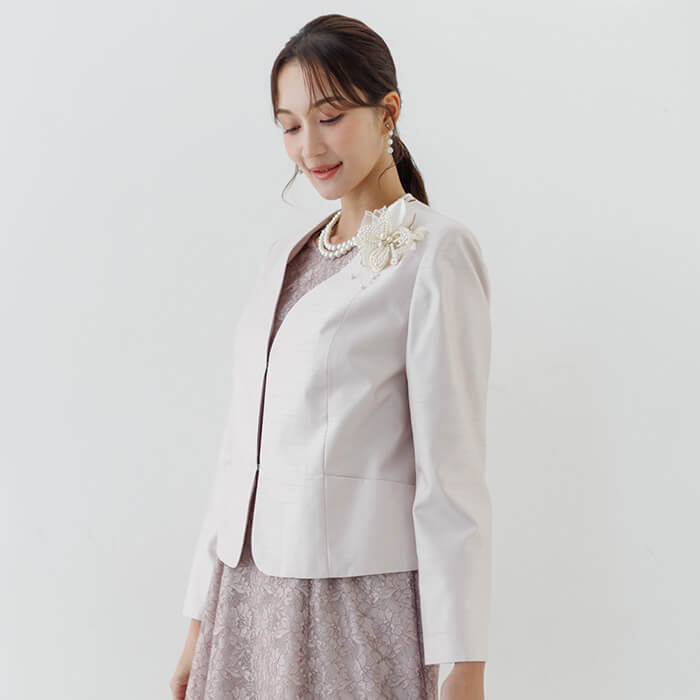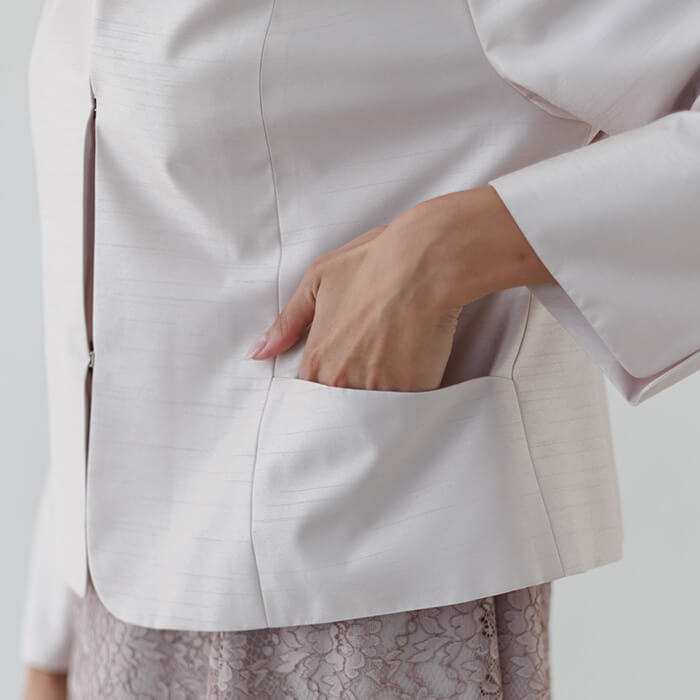 ジャケットは軽やかで光沢感があるシャンタンを使用し、華やかな印象です。 Vネックは全体をすっきりと見せられます。ポケットにはハンカチやリップを収納可能。