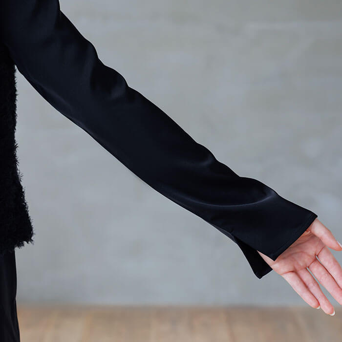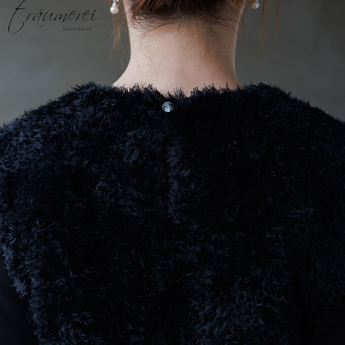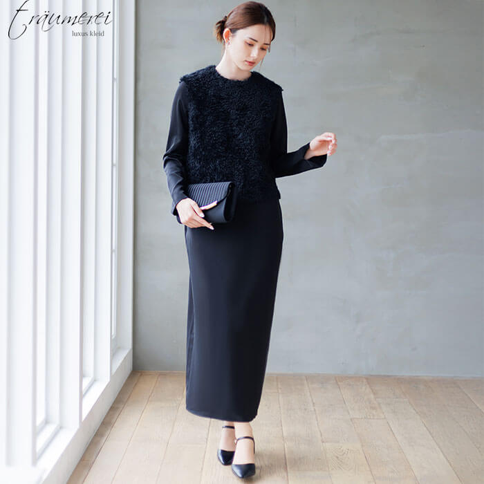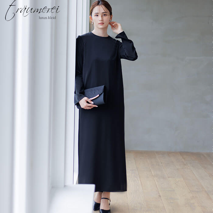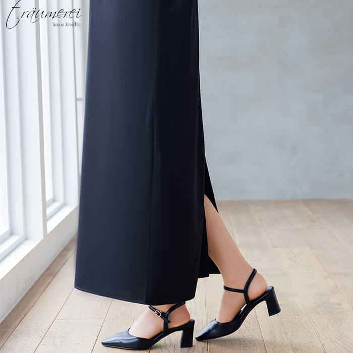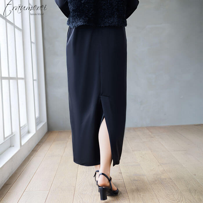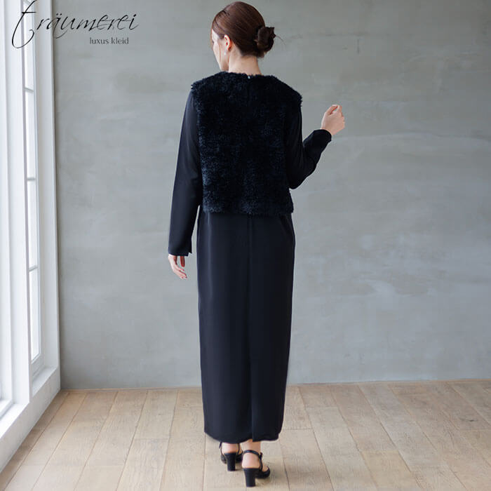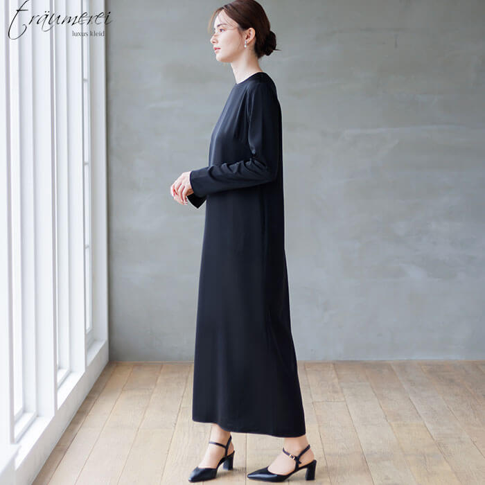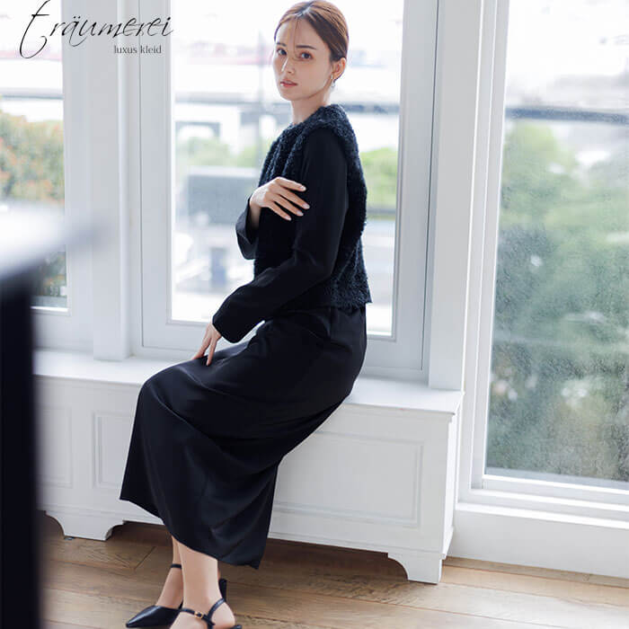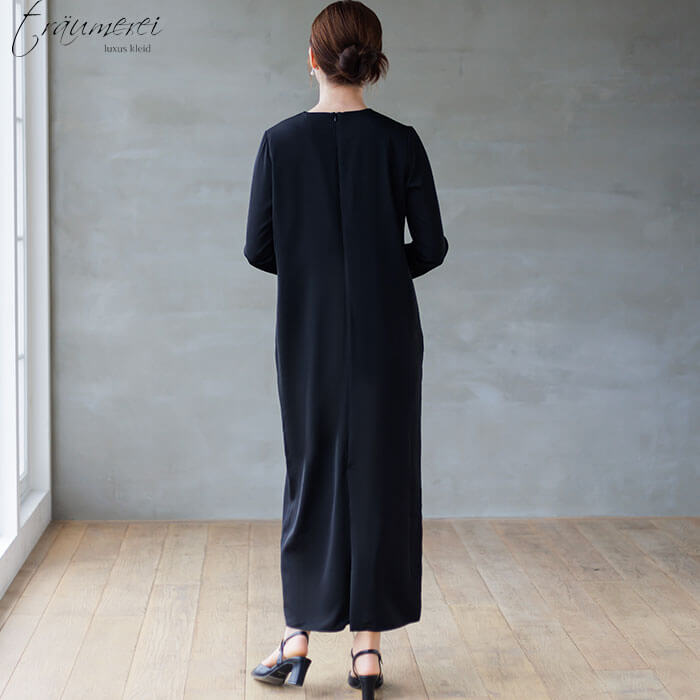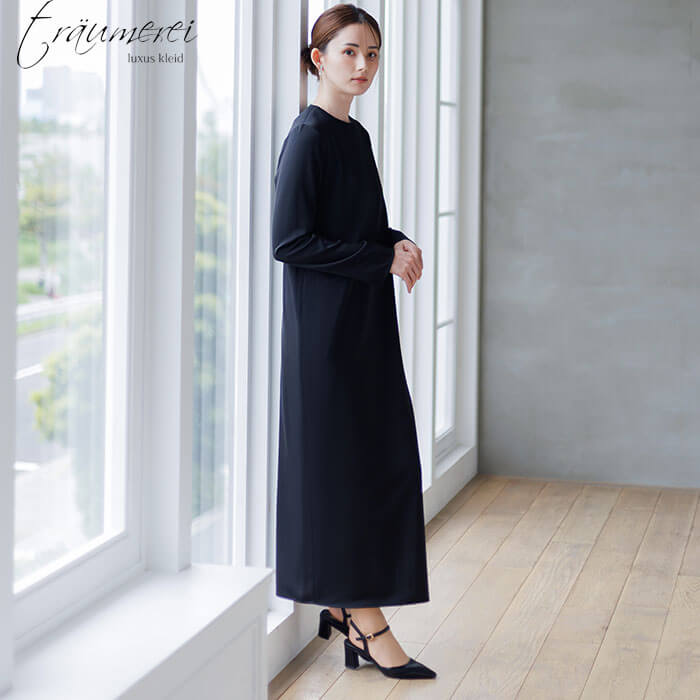 ワンピースは、やわらかく程よい光沢を持つ素材を使用。後ろにはスリットが入っているので足さばきも良く、動きやすさにも配慮しています。単体でもシンプルなワンピースとして着用でき、華やかなアクセサリーと合わせれば、1枚でパーティーシーンにもぴったりです。