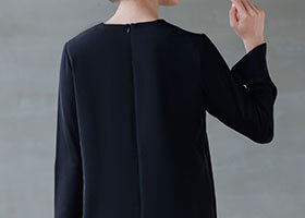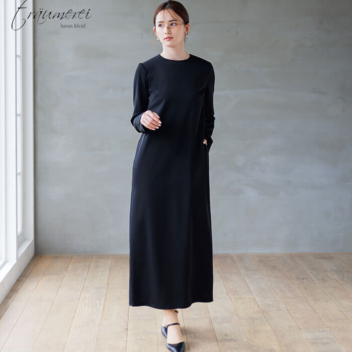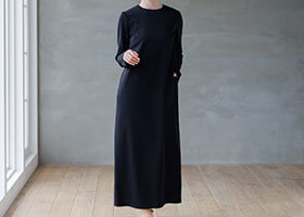 シンプルで美しいシルエットが特徴。単品でも、身体のラインを拾わず、サイドに施されたダーツが自然な立体感を生み出し、引き締まった印象を与えます。クローゼットに1着あると便利な万能ドレスです。