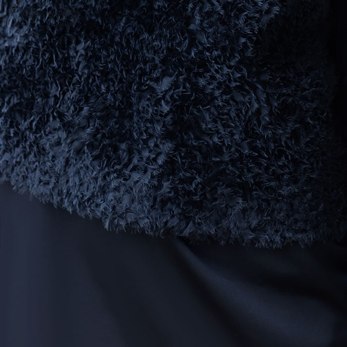 繊細なチュールテープ刺繍を重ねたベストが目を惹くセットドレス。チュールをベースにした生地の上に、テープカットされた生地を うずまきのように全面に刺繍することで、奥行きのあるボリューム感を表現しています。