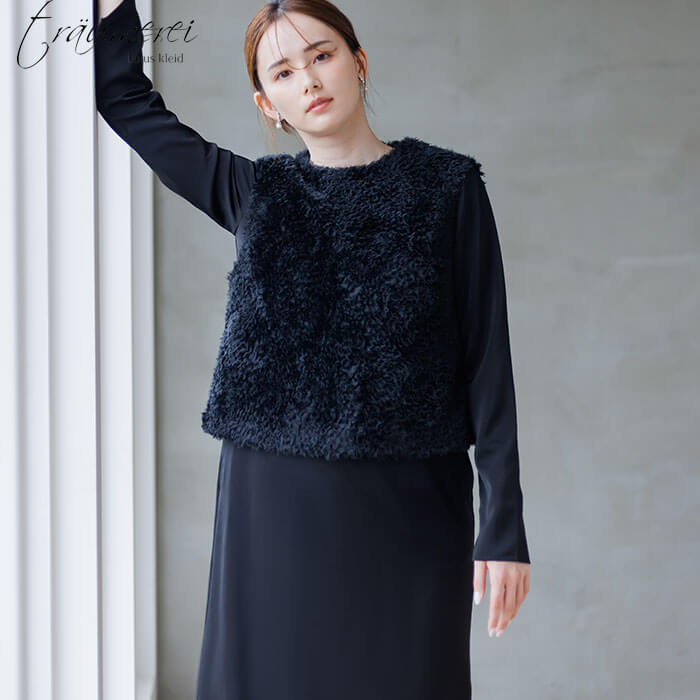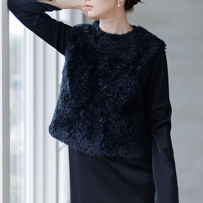 ベストは1枚でも着用可能。Tシャツやシャツとレイヤードすれば、カジュアルダウンして日常使いにもぴったり。甘さを抑えたデザインで、大人っぽく着られるのも魅力です。