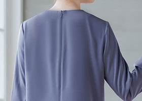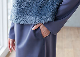 ワンピースは、やわらかく程よい光沢を持つ素材を使用。後ろにはスリットが入っているので足さばきも良く、動きやすさにも配慮しています。単体でもシンプルなワンピースとして着用でき、華やかなアクセサリーと合わせれば、1枚でパーティーシーンにもぴったりです。結婚式お呼ばれやセレモニー、お食事会、観劇、同窓会などのお出かけ着としても使用できるマルチオケージョンワンピース。寸法はキャリア向けの標準パターン。