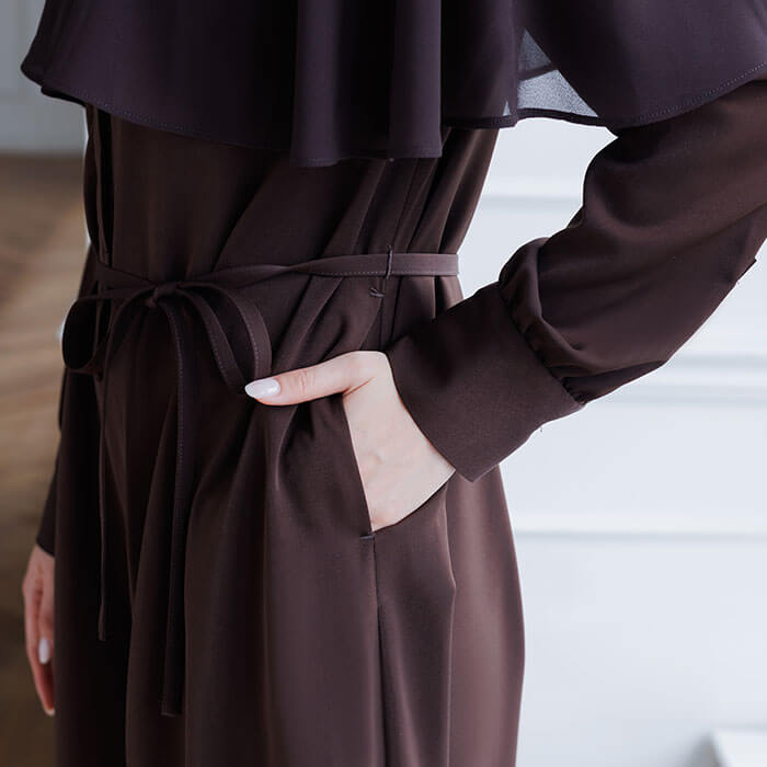 さらりと楽でありながら、あなたを凛とした印象に導くケープデザインのオールインワンドレス。軽やかなシフォンで仕立てたケープは、気になる部分を自然にカバーしながら、大人の女性らしさを引き立ててくれます。