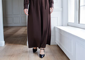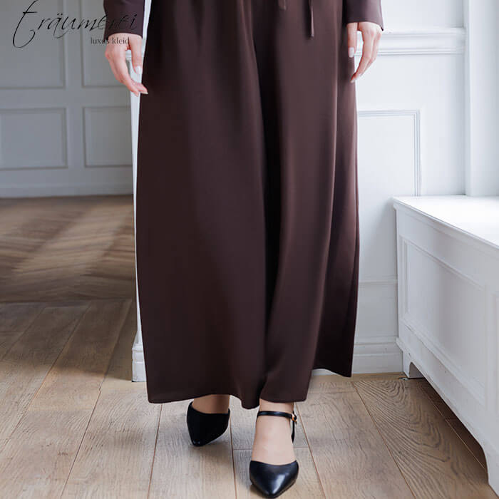 ワイドパンツは動くたびに優雅に揺れ、ドレスのような上品さと動きやすさを両立。身体が泳ぐようなゆったり感がありながら、ストンと落ちるシルエットで自然な体型カバーを叶えます。