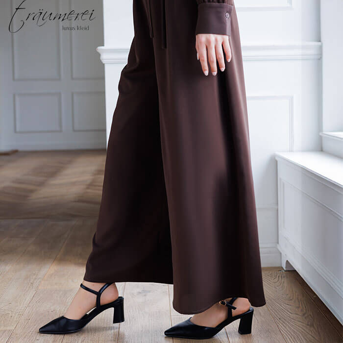 ボディにはとろみのある微光沢サテン素材を使用し、パンツでありながらドレスのように見えるシルエットを実現。セレモニースーツやオフィスウェアとしても活躍します。体のラインを拾わないストレートなシルエットと、素材特有の軽やかな着心地で、長時間心地よく着用できる一枚です。