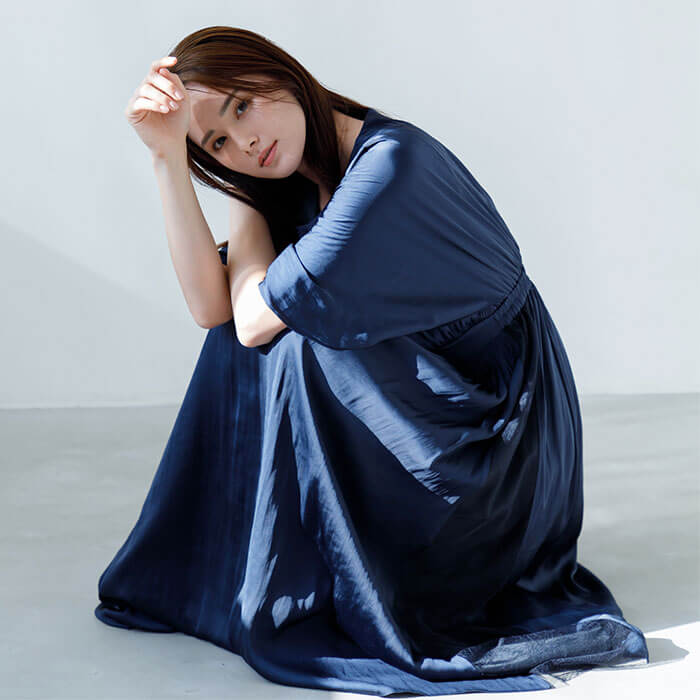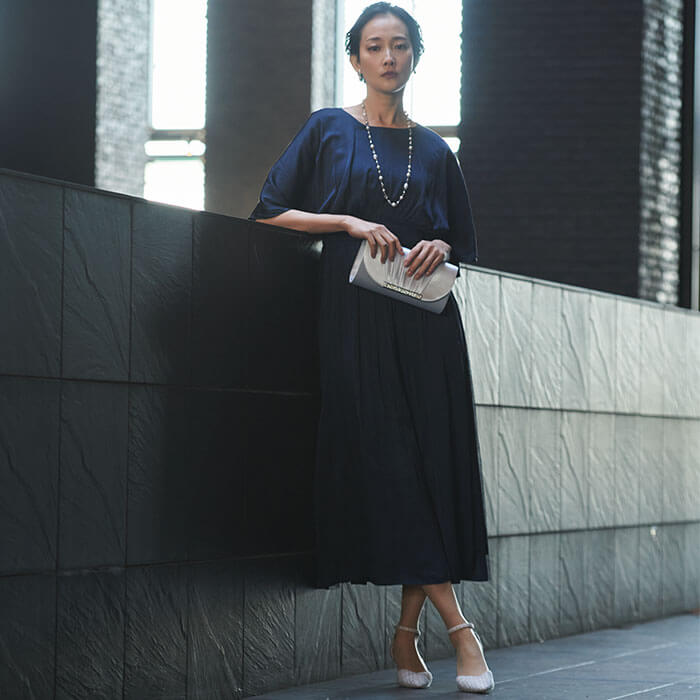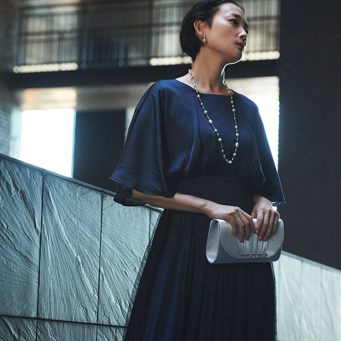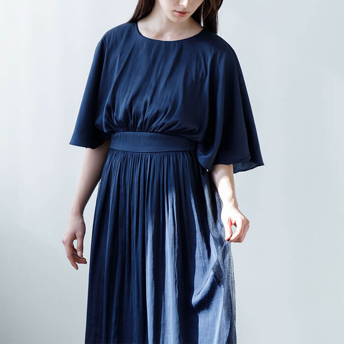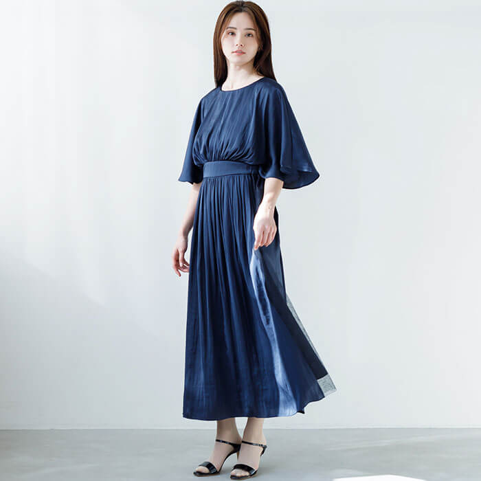 結婚式はもちろん、カジュアルにも使える着回し力抜群なドレス。素材は軽やかな「ビンテージサテン」を使用。ふわっと羽織っているような軽量感と程よいハリ感で、華やかなシルエットを生み出します。袖はケープ風のシルエットで二の腕をすっぽりと覆うデザインに仕上げ、腕周りのラインを曖昧に。動きやすさの機能性も兼ね備えています。ウェストはゴム仕様にして、ストレスを感じにくい着やすさを追求した1着です。