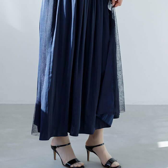 デザインアクセントととして、スカート部分両脇に上質なチュールレースを使用。より華やかな装いを演出します。