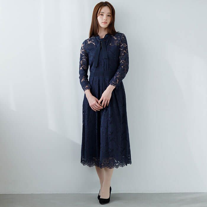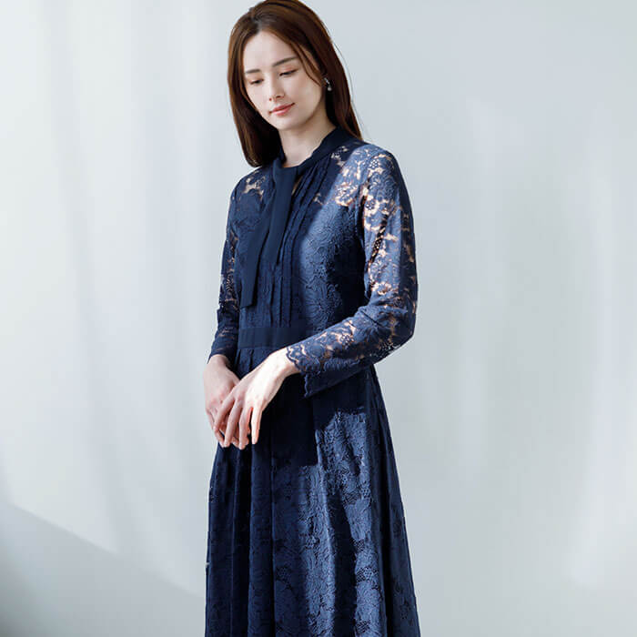 結婚式はもちろん、パーティーやちょっとしたお出かけにも重宝するボウタイレースドレス。上質感を表現する、しっかりめのコードレースとジョーゼットを使用。袖は8分丈のスッキリとしたラインに。肌の露出を抑えつつ、全体的に細見えするイメージに仕上げました。ウェスト後ろ側はゴム仕様に。細見えしながらも着用時にストレスを感じにくい1着です。
