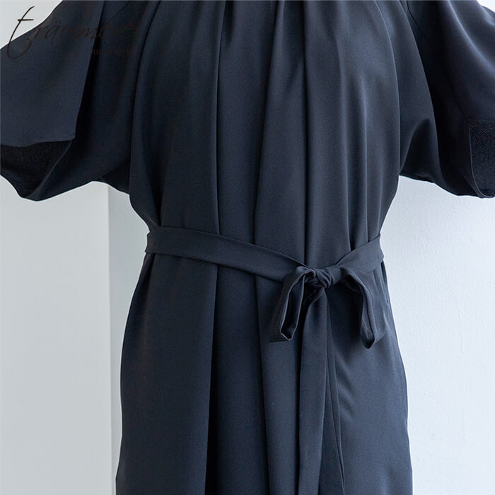 袖に施したニュアンスのあるドレープが魅力の、ゆったりシルエットのオールインワンドレス。流れるようなラインが二の腕をやさしくカバーし、自然と女性らしい印象に導きます。身頃はたっぷりとゆとりを持たせ、軽やかでストレスフリーな着心地に。リラックス感がありながらも、品よく見える絶妙なバランスに仕上げました。さらに、ギャザーディテールが縦のラインを引き立て、すっきりとした印象をプラス。付属のベルトでウエストマークすればメリハリのある着こなしに、首元に巻けばチョーカー風のアレンジも楽しめます。