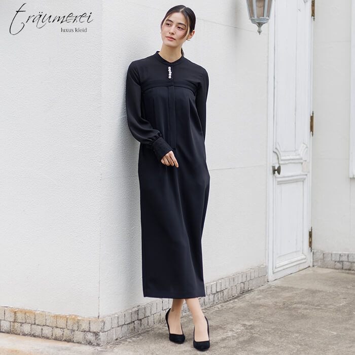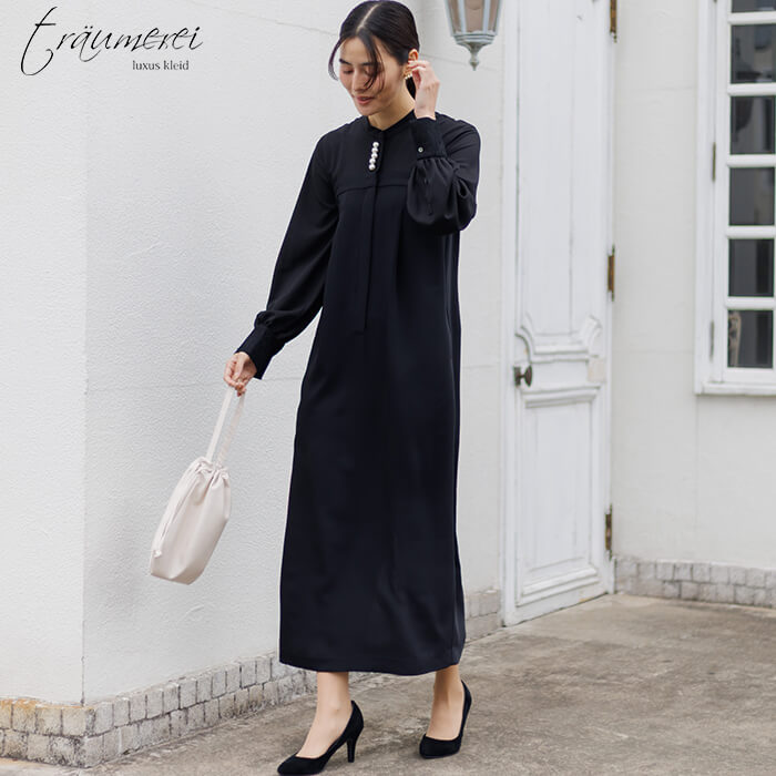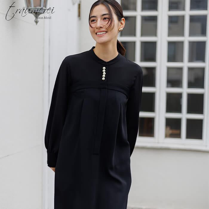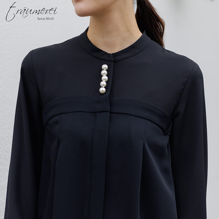 襟元には5連パールをあしらい、アクセサリーいらずで顔まわりを明るく上品に。程よいゆとりがありながら、縦長ラインが自然とすっきり見せてくれるシルエットです。