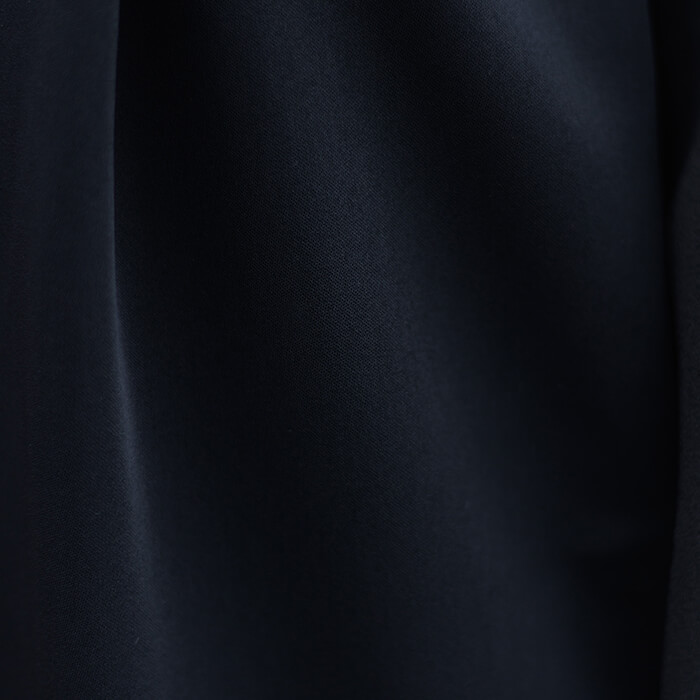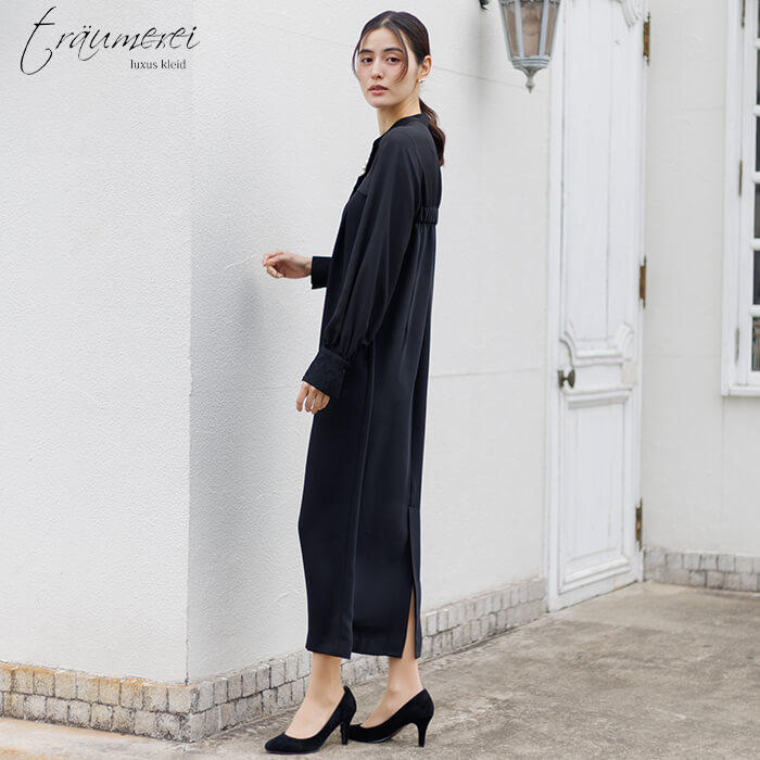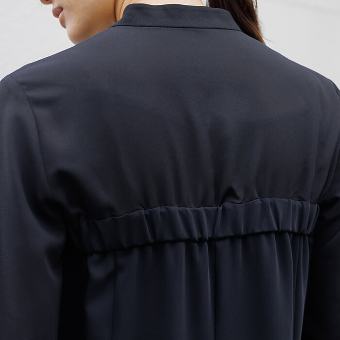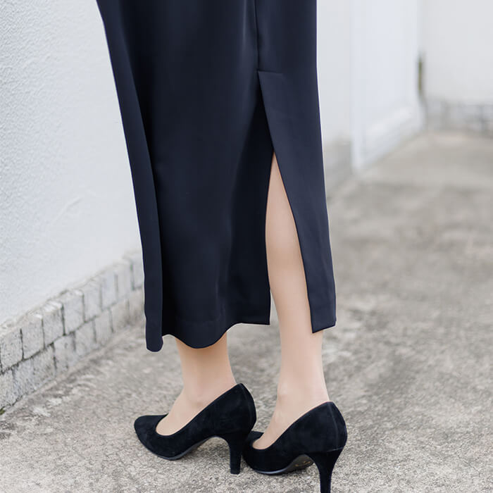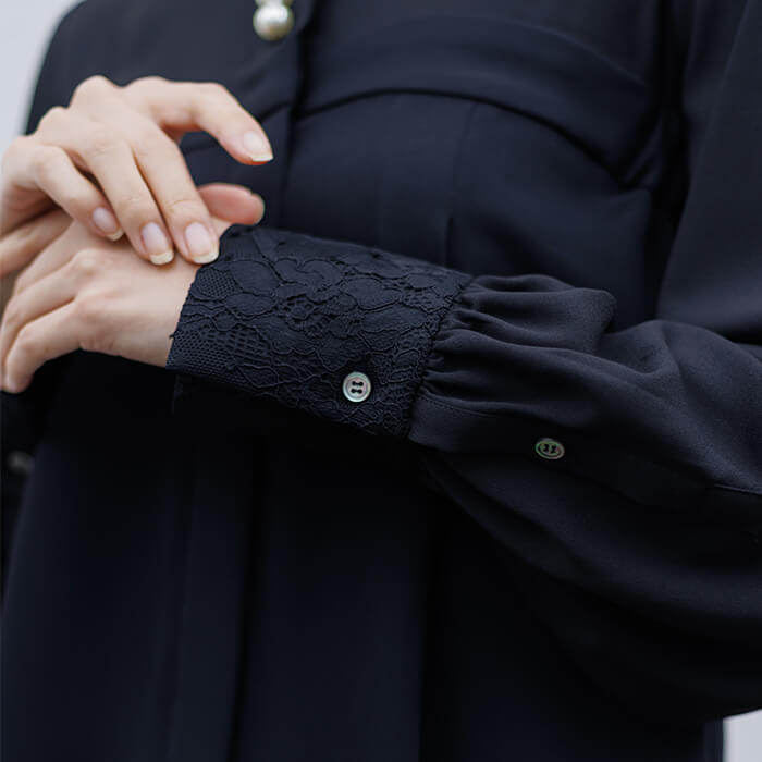 ヨークから袖にかけては、透けにくいシフォン素材を使用。軽やかで上品な印象に仕上げました。座り姿も品よく見える、ナロー丈もポイントです。