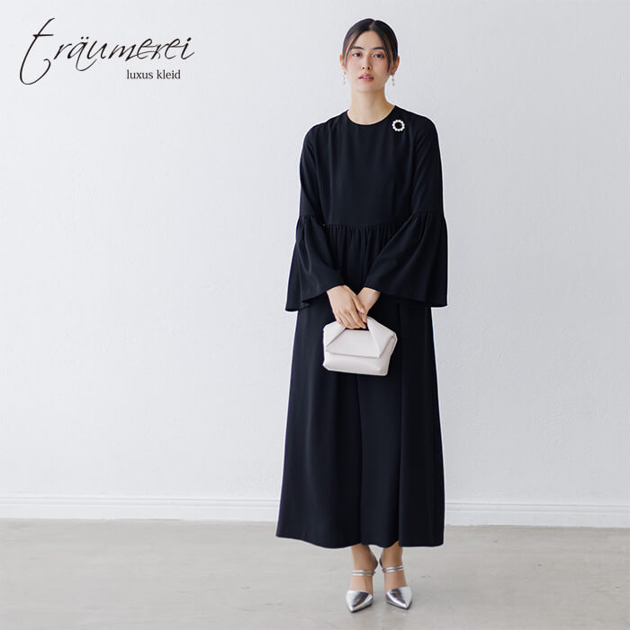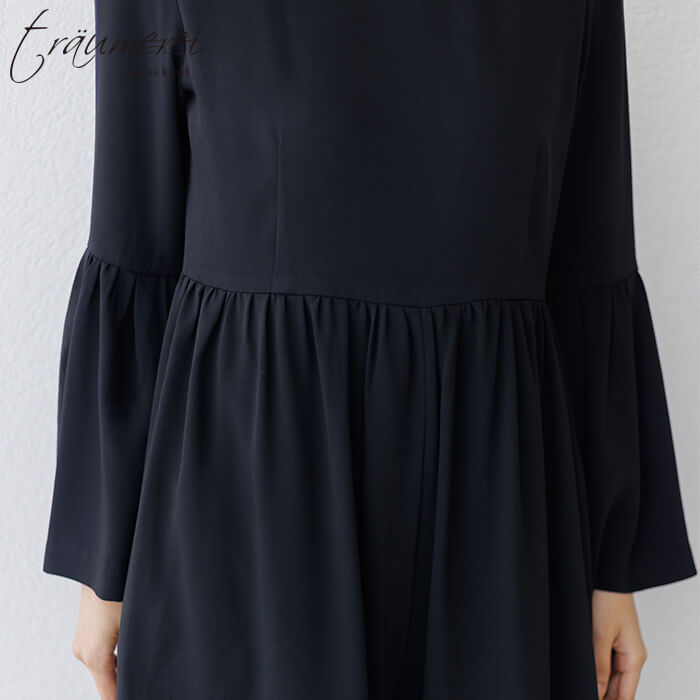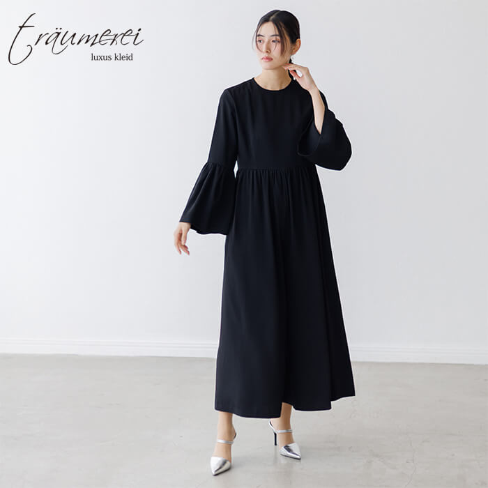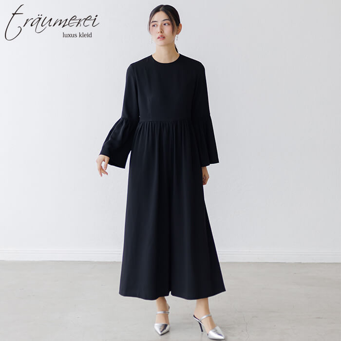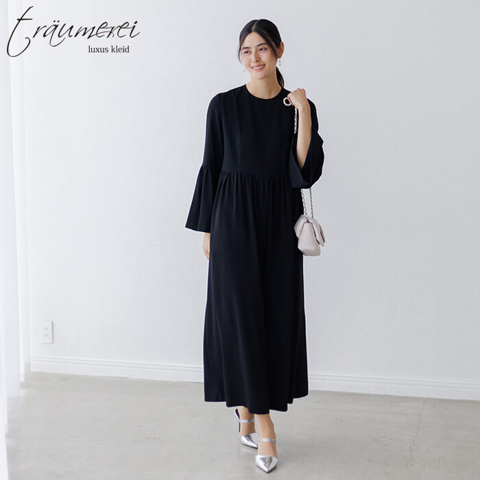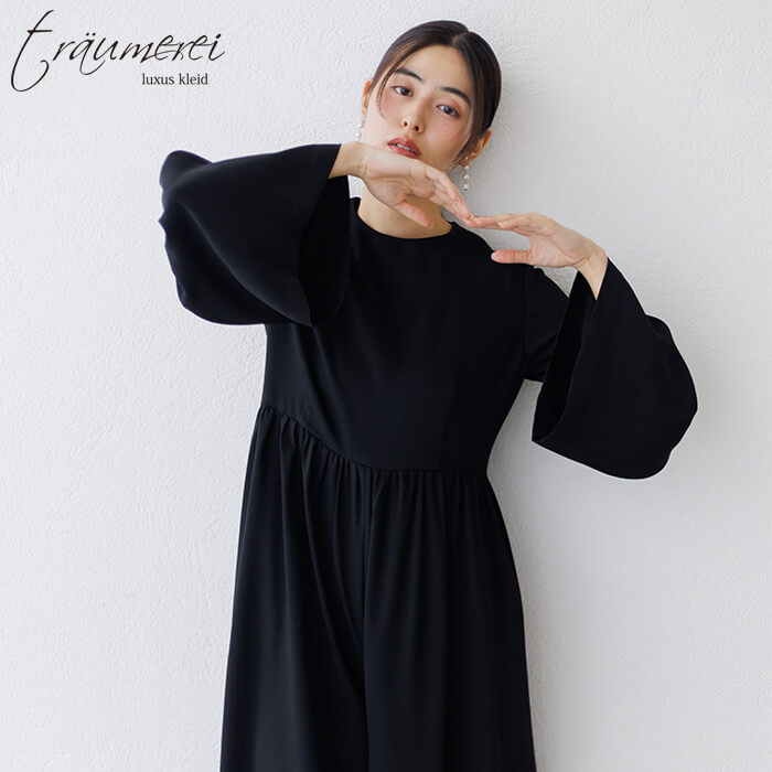 ボリュームたっぷりのベルスリーブが華やかさをプラスする、オールインワンドレス。高めのウエスト切り替えでスタイルアップを叶えつつ、ギャザーをあしらうことでお腹まわりをさりげなくカバーします。