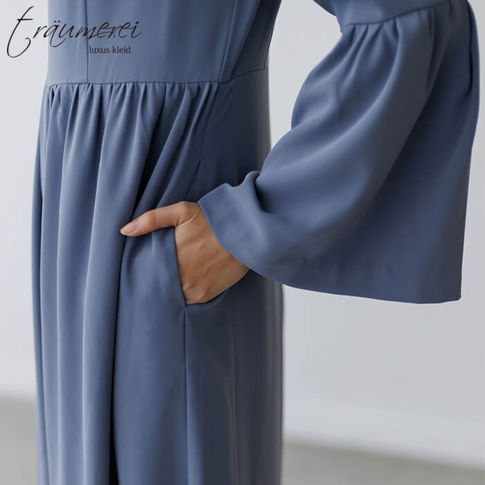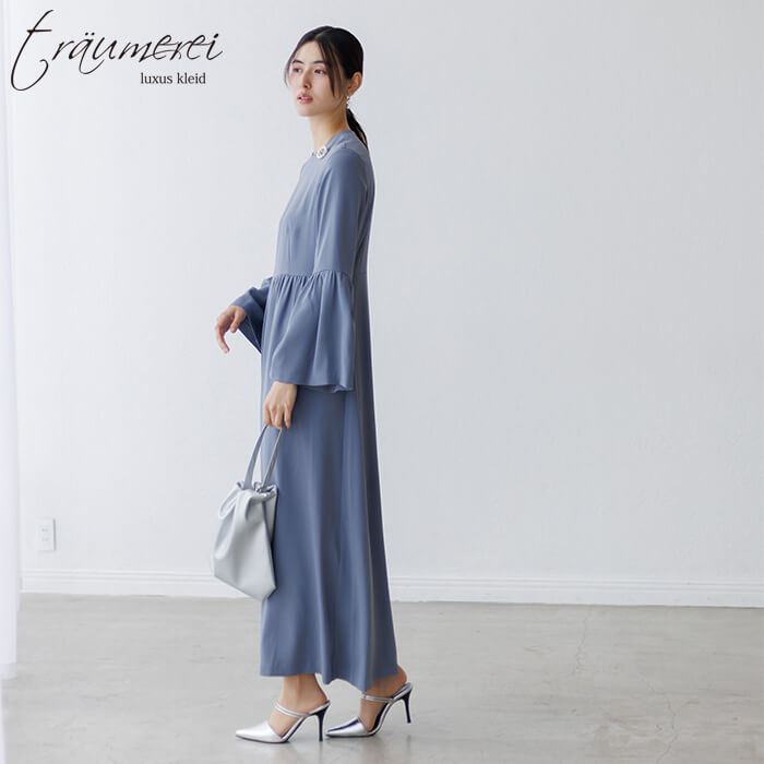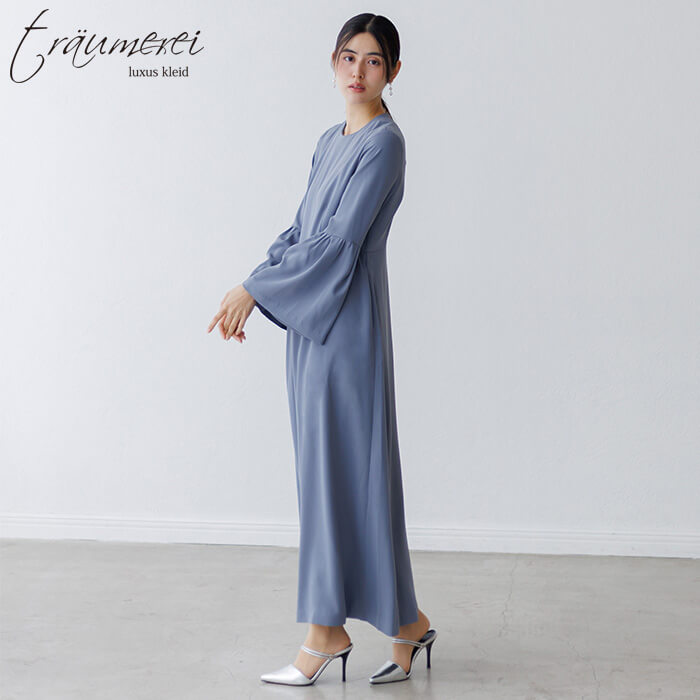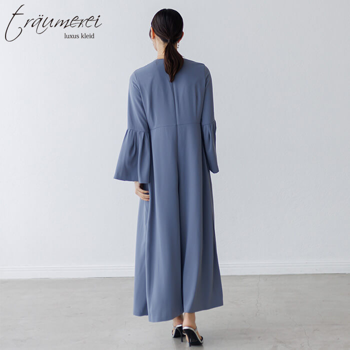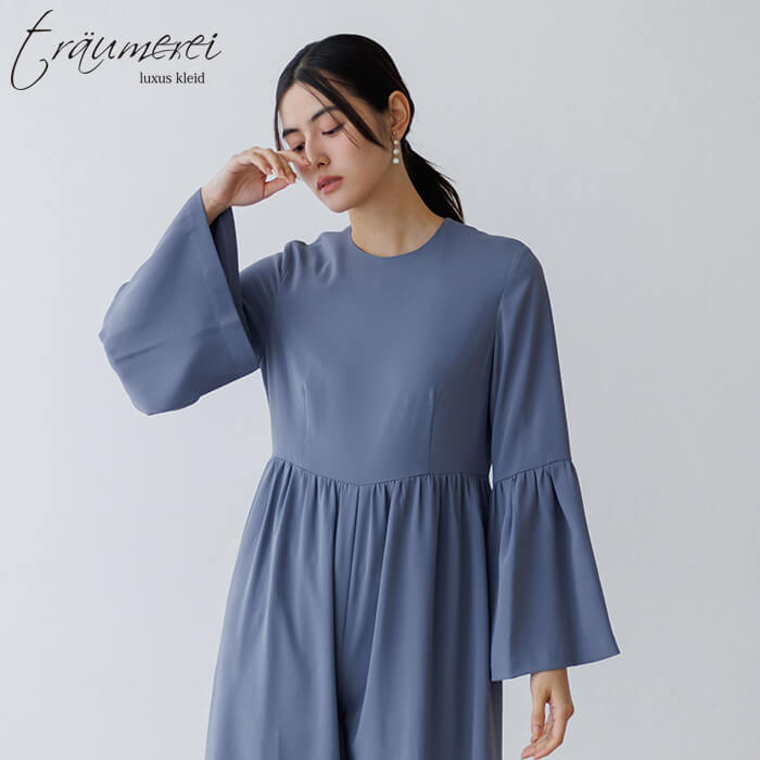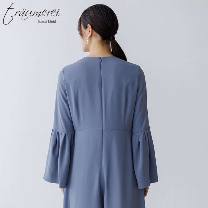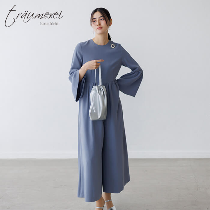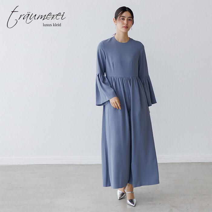 ボリュームたっぷりのベルスリーブが華やかさをプラスする、オールインワンドレス。高めのウエスト切り替えでスタイルアップを叶えつつ、ギャザーをあしらうことでお腹まわりをさりげなくカバーします。