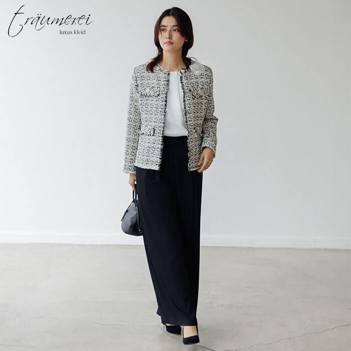 セレモニーシーンはもちろん、ちょっとしたお出かけや行事に重宝するワイドパンツスーツ。表面感と凹凸感のある上質なファンシーツイードを使用。見た目よりも柔らかな質感が特徴です。パンツは柔らかなジョーゼットで仕上げた、身体のラインを拾わないワイドパンツ。生地のとろみと落ち感を活かし、ワイドながらもすっきりとしたシルエットに仕上げました。