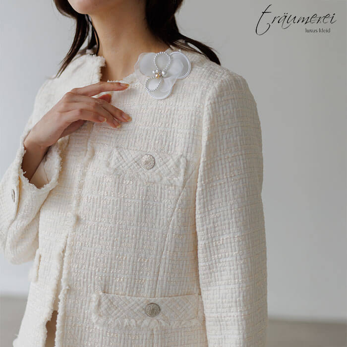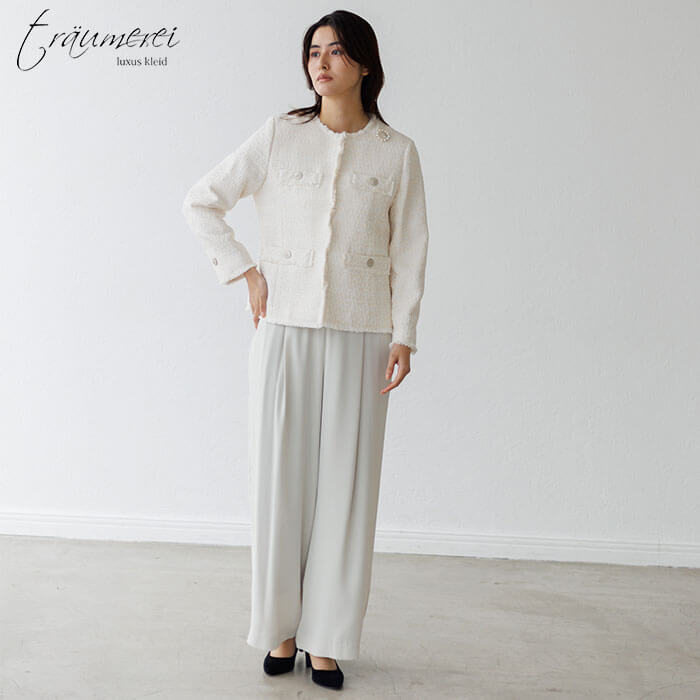 セレモニーシーンはもちろん、ちょっとしたお出かけや行事に重宝するワイドパンツスーツ。表面感と凹凸感のある上質なファンシーツイードを使用。見た目よりも柔らかな質感が特徴です。パンツは柔らかなジョーゼットで仕上げた、身体のラインを拾わないワイドパンツ。生地のとろみと落ち感を活かし、ワイドながらもすっきりとしたシルエットに仕上げました。
