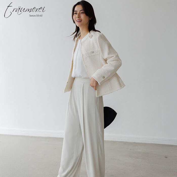 セレモニーシーンはもちろん、ちょっとしたお出かけや行事に重宝するワイドパンツスーツ。表面感と凹凸感のある上質なファンシーツイードを使用。見た目よりも柔らかな質感が特徴です。パンツは柔らかなジョーゼットで仕上げた、身体のラインを拾わないワイドパンツ。生地のとろみと落ち感を活かし、ワイドながらもすっきりとしたシルエットに仕上げました。