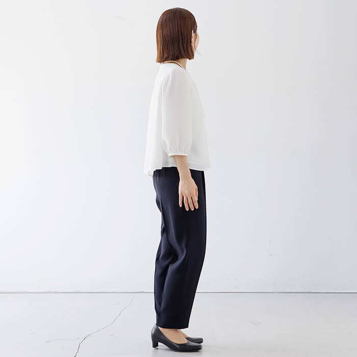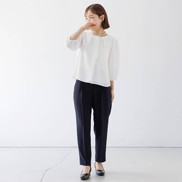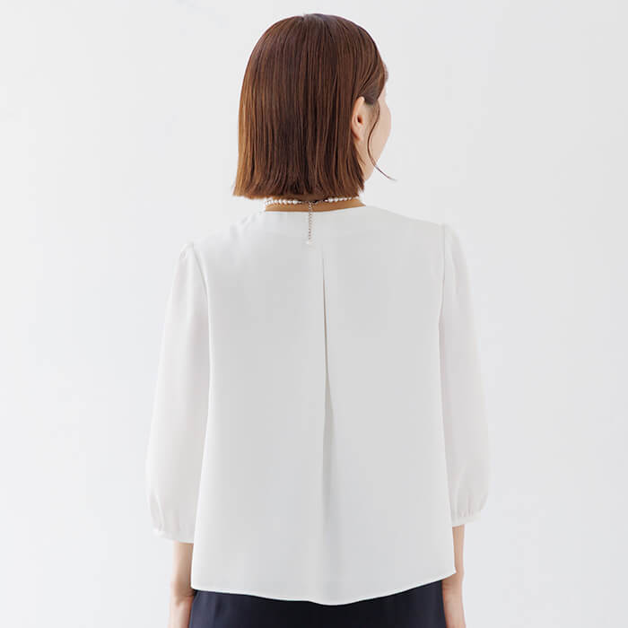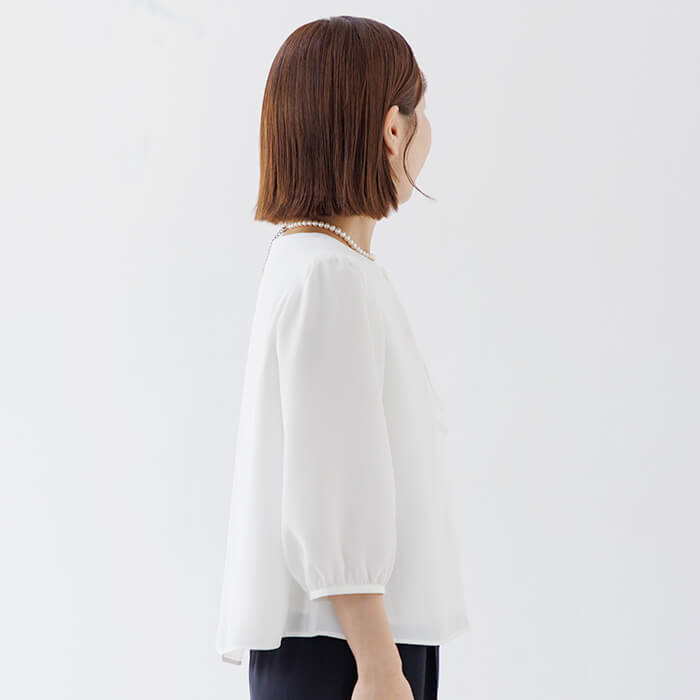 セレモニージャケットとの相性を考えて仕立てた、上品なボウタイ風白ブラウス。小柄女性に向けて着丈や袖丈のバランスにこだわったブラウスです。首元に自然な立体感を生むボウタイ風デザインが、式典や入卒シーンの装いを華やかに彩ります。着丈は51cm(9号)でジャケットの裾からはみ出しにくい絶妙なバランス。cahoさん監修企画別売りのセレモニースーツ(4502930-73)ともコーディネート可能です。きちんと感を保ちながらも動きやすく、1枚でもインナーとしても使える万能さが魅力。セレモニーだけでなく、通勤やお食事会など幅広いコーディネートに着回せる、頼れる1着です。