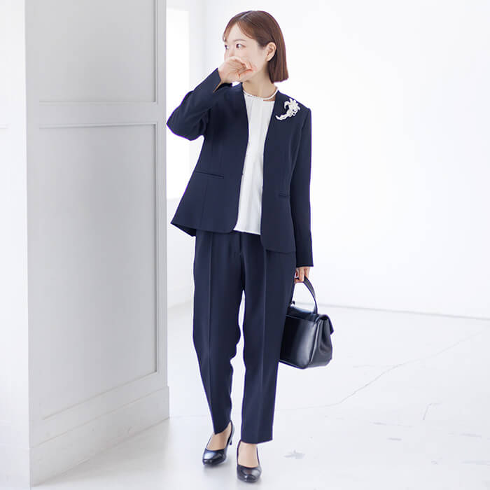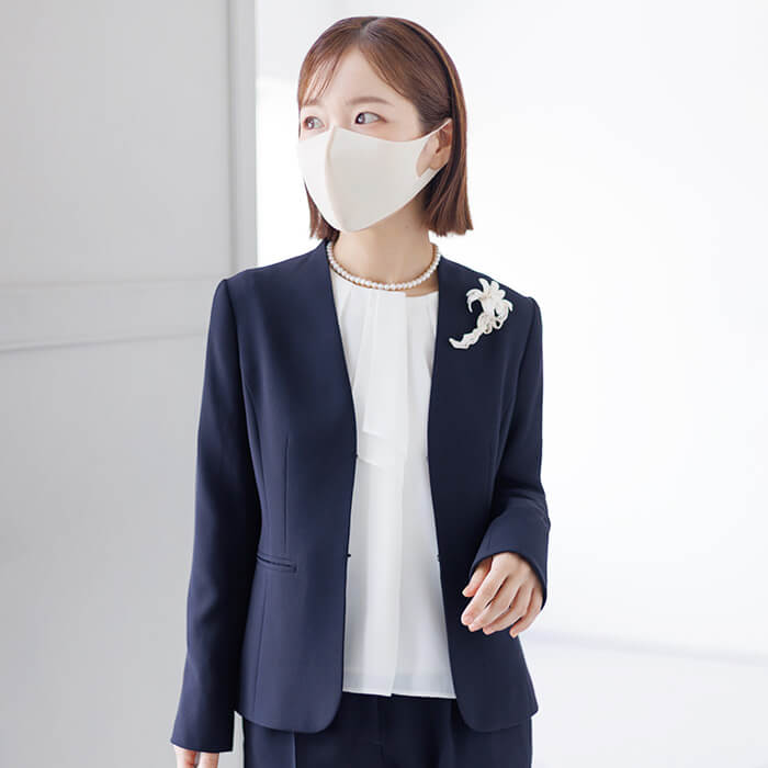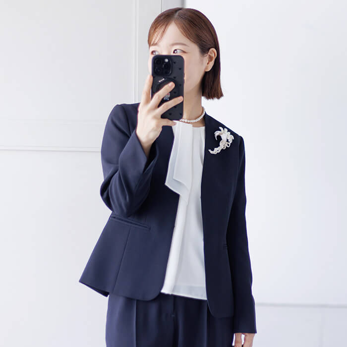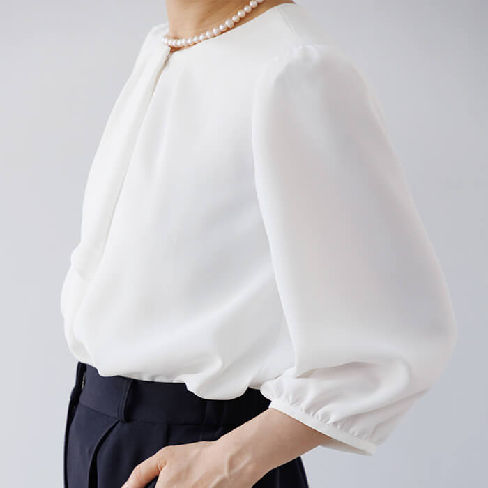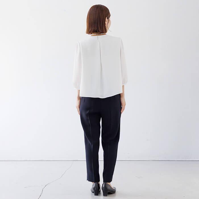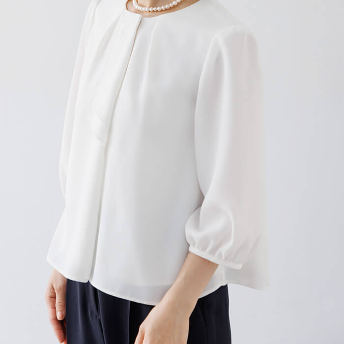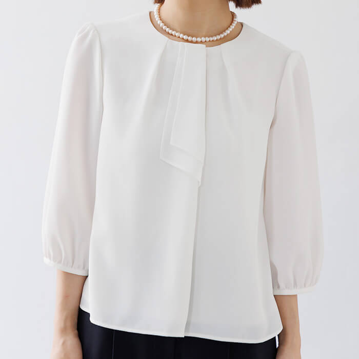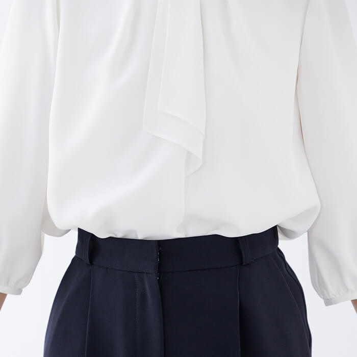 ボウタイ風デザインのブラウスは、ジャケットを開けても閉めても様になるボリューム感で仕上げました。