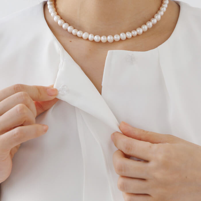 フロントにスナップボタンが1つ付き、程よい開きでそのままかぶって着られる仕様です。